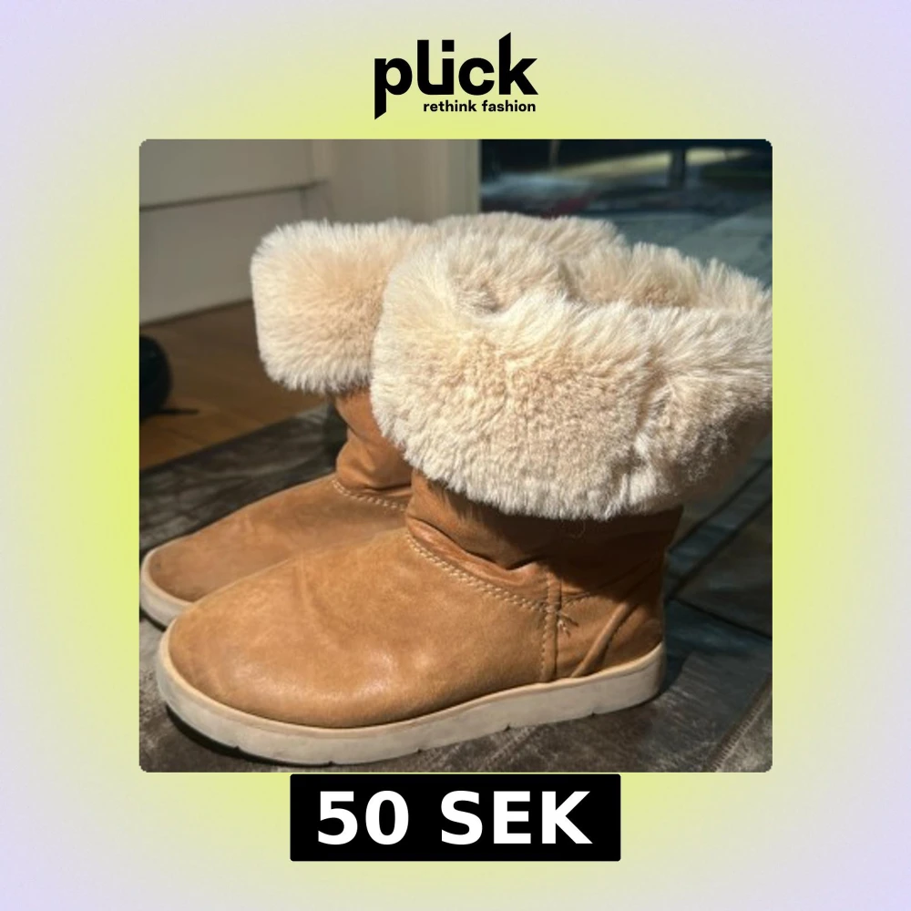Säljer ett par bruna boots med mjukt beige pälsfoder. Perfekta för kalla dagar med sin varma och bekväma design. De har en rund tå och en stabil sula som ger bra grepp.