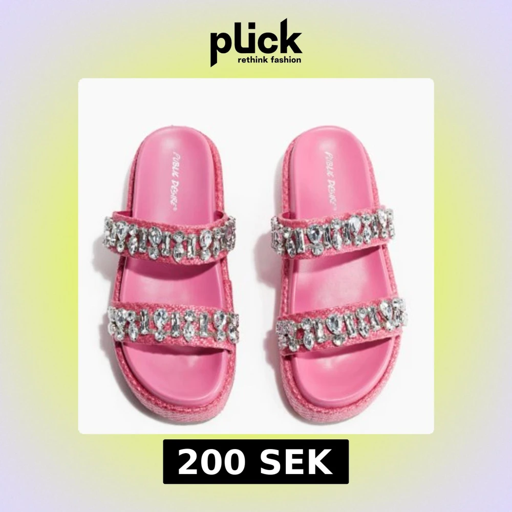 Superfina rosa sandaler med två breda remmar täckta av stora glittrande strassdetaljer. Snygg chunky sula och öppen tå, perfekt för att sticka ut. Materialet är en mix av syntet och textil med en lyxig känsla.
