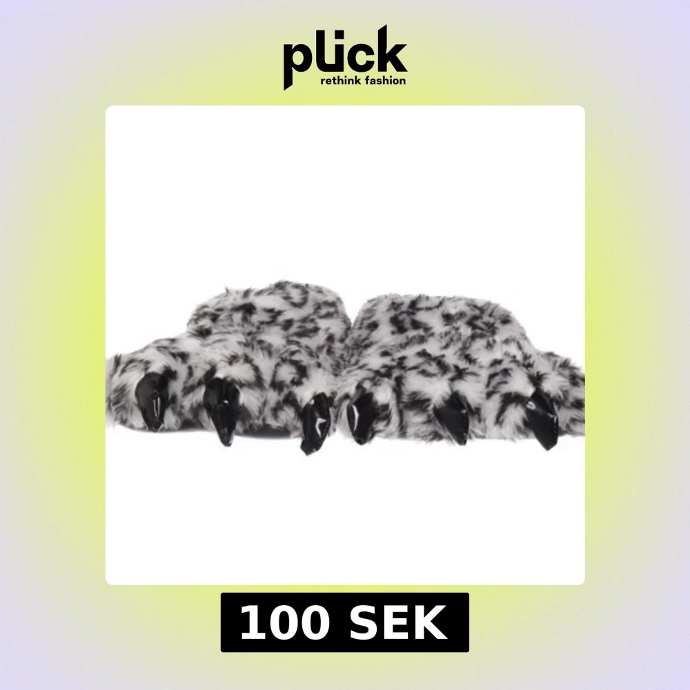 Roliga och unika tofflor i svartvitt leopard-mönster med päls och svarta klor. Storlek: 36-40