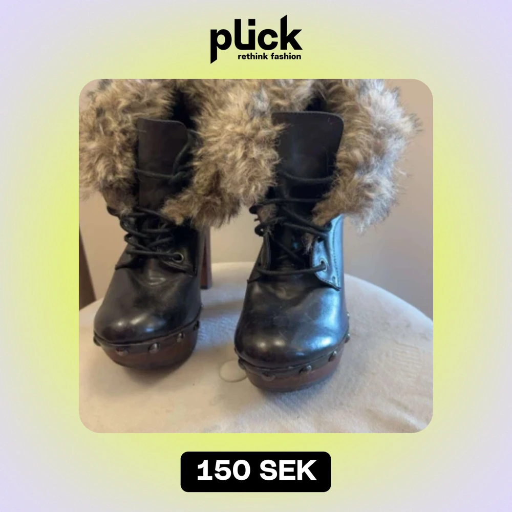 Säljer ett par snygga svarta boots från Soretti. De har en hög klack och är dekorerade med päls runt skaftet. Skorna har snörning framtill och nitar längs sulan för en extra cool look. Perfekta för höst och vinter!