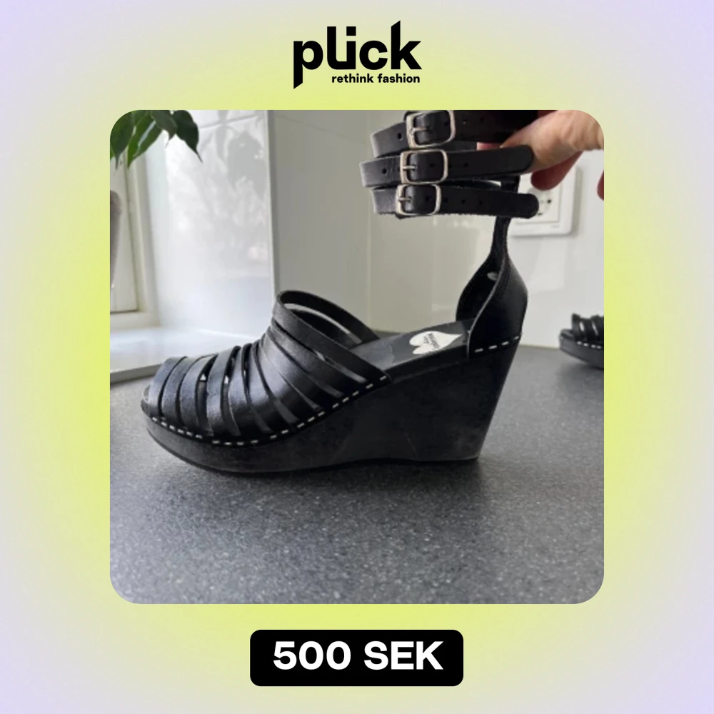 Svarta ”träskor” med ovandel i läder från Swedish Hasbeens från deras samarbete med H & M. Kilklack och tre remmar kring vristen med spännen. Fint skick.
