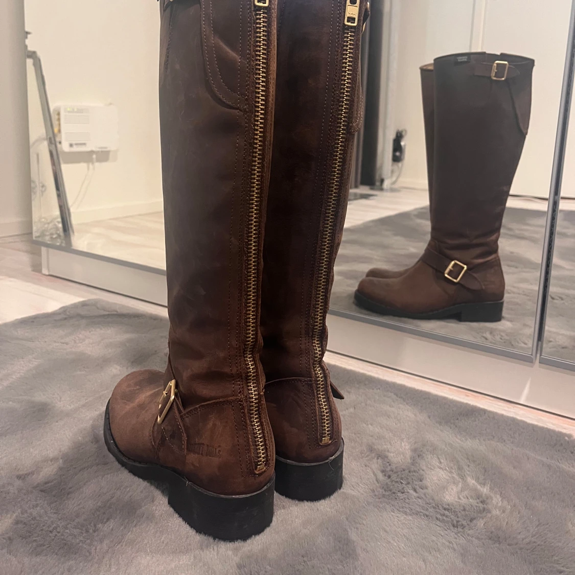Snygga bruna stövlar i skinn med dragkedja baktill och dekorativt spänne på sidan. Perfekta för höst och vinter med en robust sula för extra grepp. Stilrena och funktionella för en trendig look.