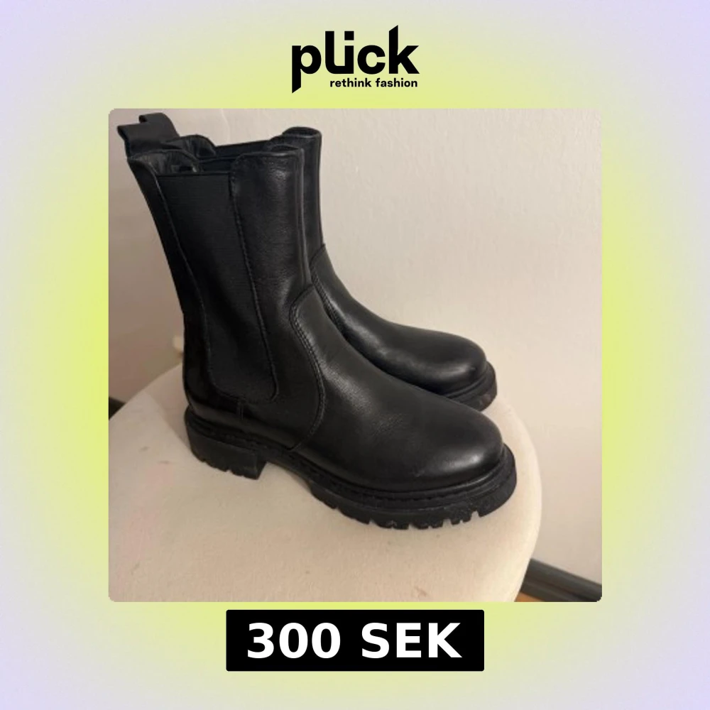 Säljer ett par svarta chelsea boots med grov, chunky sula och rund tå. Bootsens ovandel är i slätt skinn och har elastiska paneler på sidorna för enkel på- och avtagning. Perfekta för dig som gillar en edgy och stilren look.