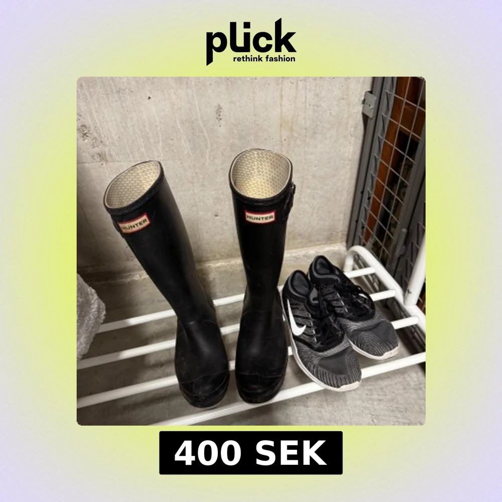 Säljer ett par klassiska svarta Hunter stövlar med högt skaft och ett par svarta Nike sneakers med vit sula och vit swoosh. Perfekta för regniga dagar och träning.
