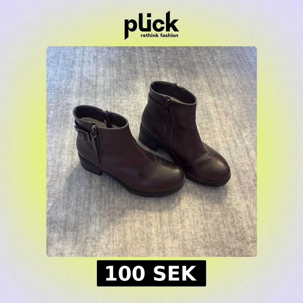 Snygga mörkbruna boots i skinn med rund tå och låg klack. Skorna har dragkedja på sidan och ett dekorativt spänne baktill. Perfekta för höst och vinter och passar till många olika outfits.