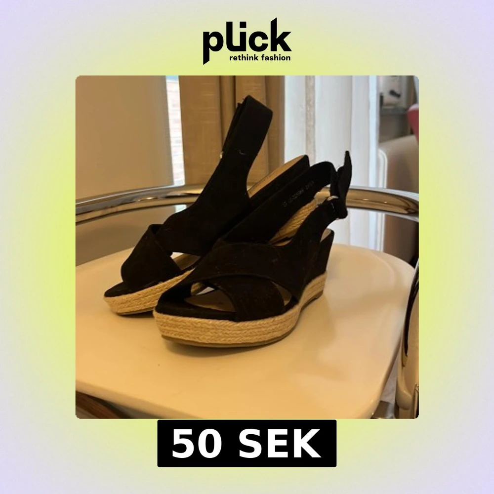 Snygga svarta sandaler med kilklack och öppen tå. Ovandelen är i mjuk mocka och sulan har ett flätat repmönster som ger en chill sommarkänsla. Perfekt för dig som gillar att höja stilen med en bekväm plattform. Remmen runt hälen gör att de sitter bra på foten.