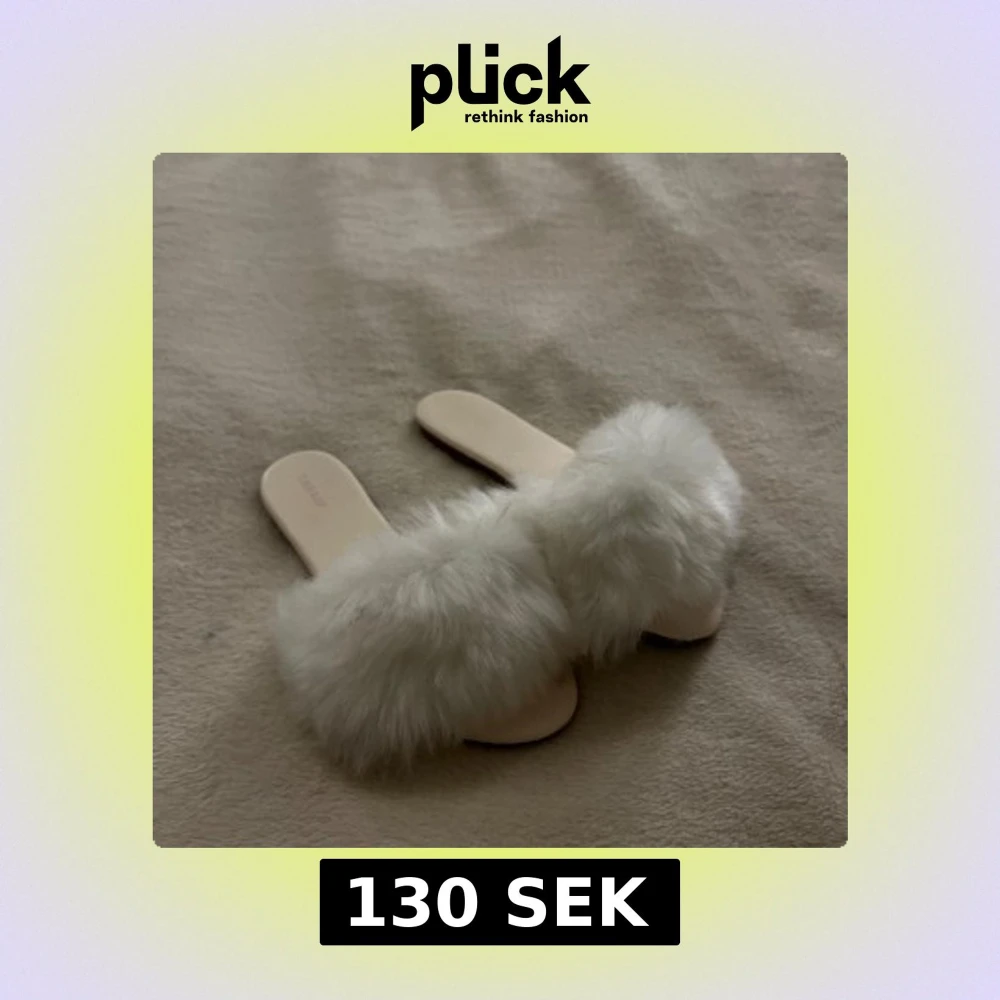 Säljer ett par supermjuka och fluffiga sandaler i vitt med bred rem i fuskpäls. Perfekta att glida runt i hemma för en mysig känsla. Platt sula och öppen tå för extra komfort.
