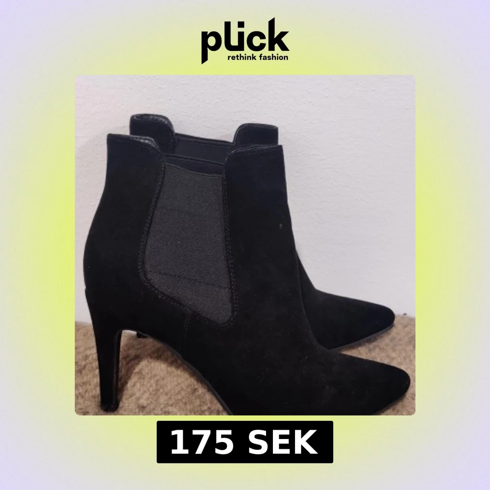 Säljer ett par svarta chelsea boots i mocka med spetsig tå och hög klack. Skorna har elastiska paneler på sidorna för enkel påtagning och en stilren, klassisk look. Perfekta för dig som vill ha en snygg och tidlös sko till garderoben.