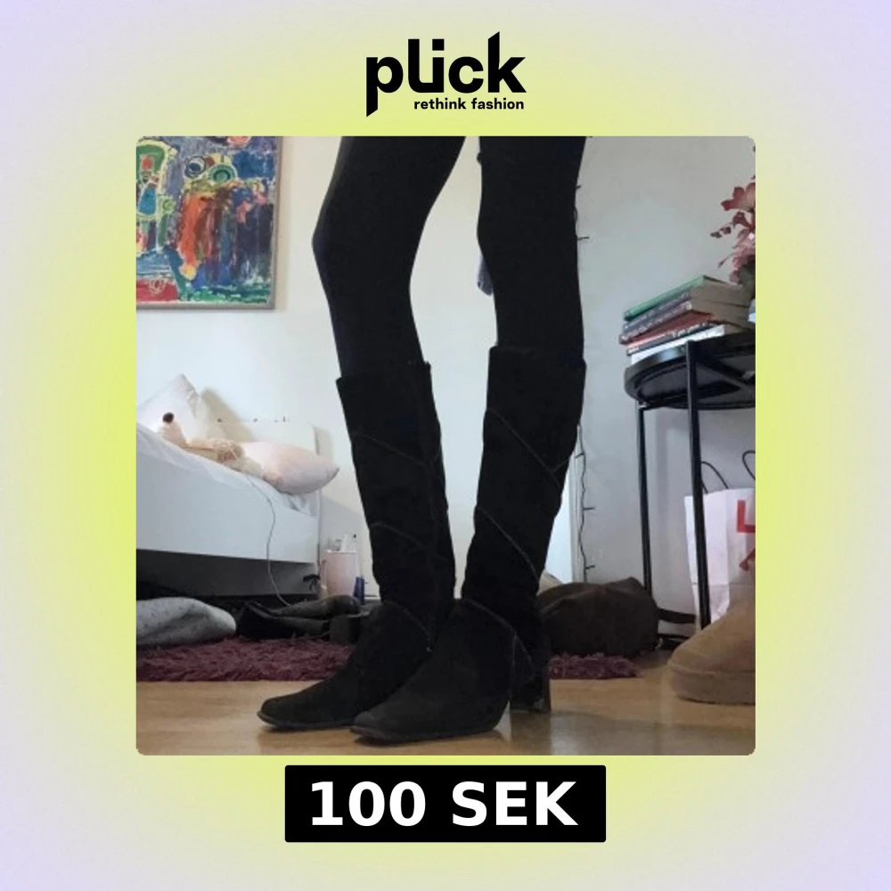 Snygga svarta stövlar i mocka med markerad klack och spetsig tå. Stövlarna har dekorativa sömmar som slingrar sig runt skaftet och ger en cool touch. Perfekta att styla med både jeans och kjol för en trendig look.