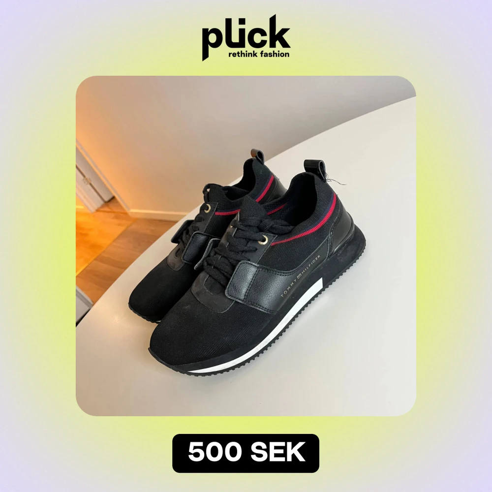 Säljer ett par snygga svarta sneakers med en cool röd detalj runt kanten. De har snörning och en bekväm sula som passar perfekt för vardagsbruk. Skorna är i mycket bra skick och redo för nya äventyr!