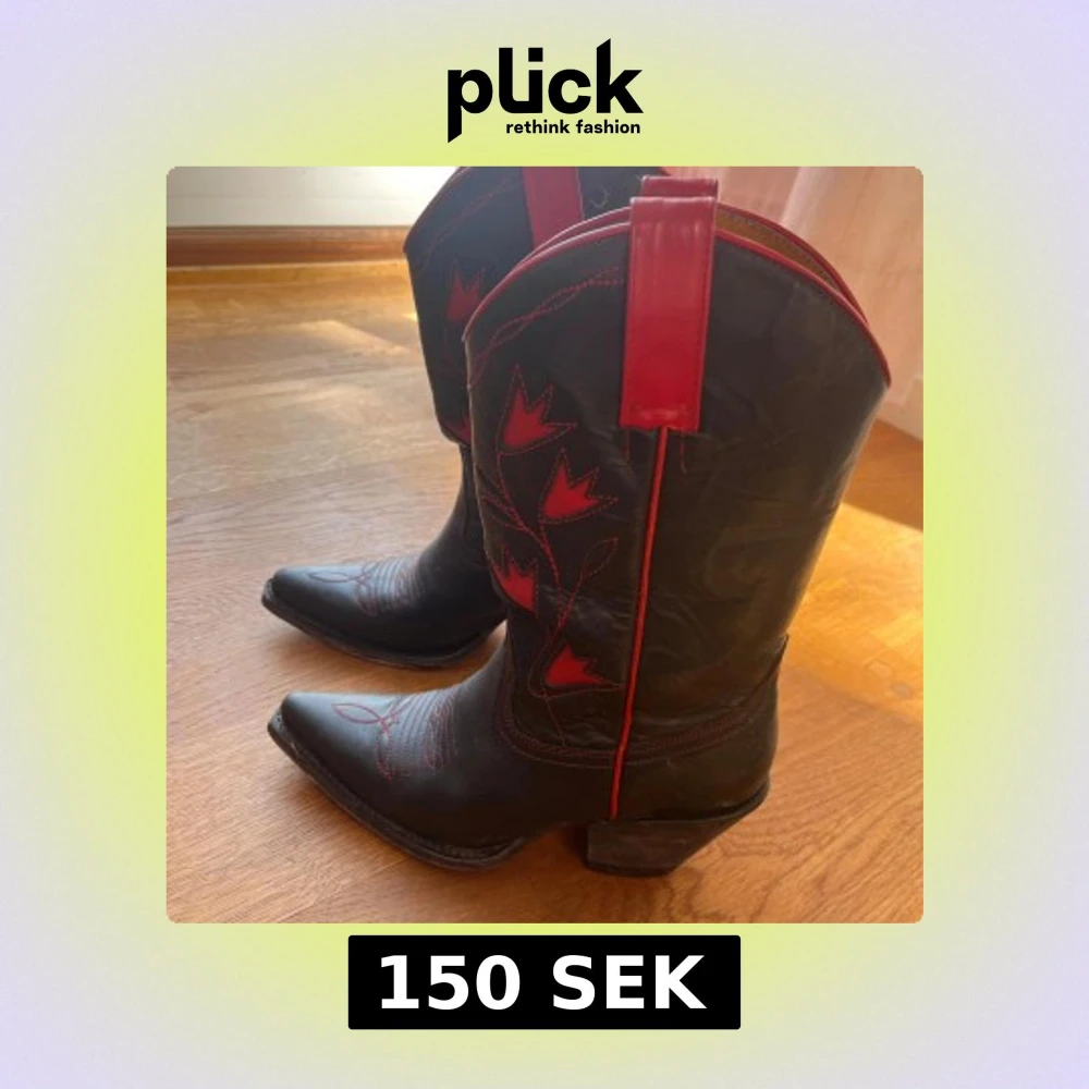 Snygga svarta cowboy boots i skinn med röda broderade blommor och detaljer. De har en spetsig tå och en stabil klack. Perfekta för att ge din outfit en cool touch.