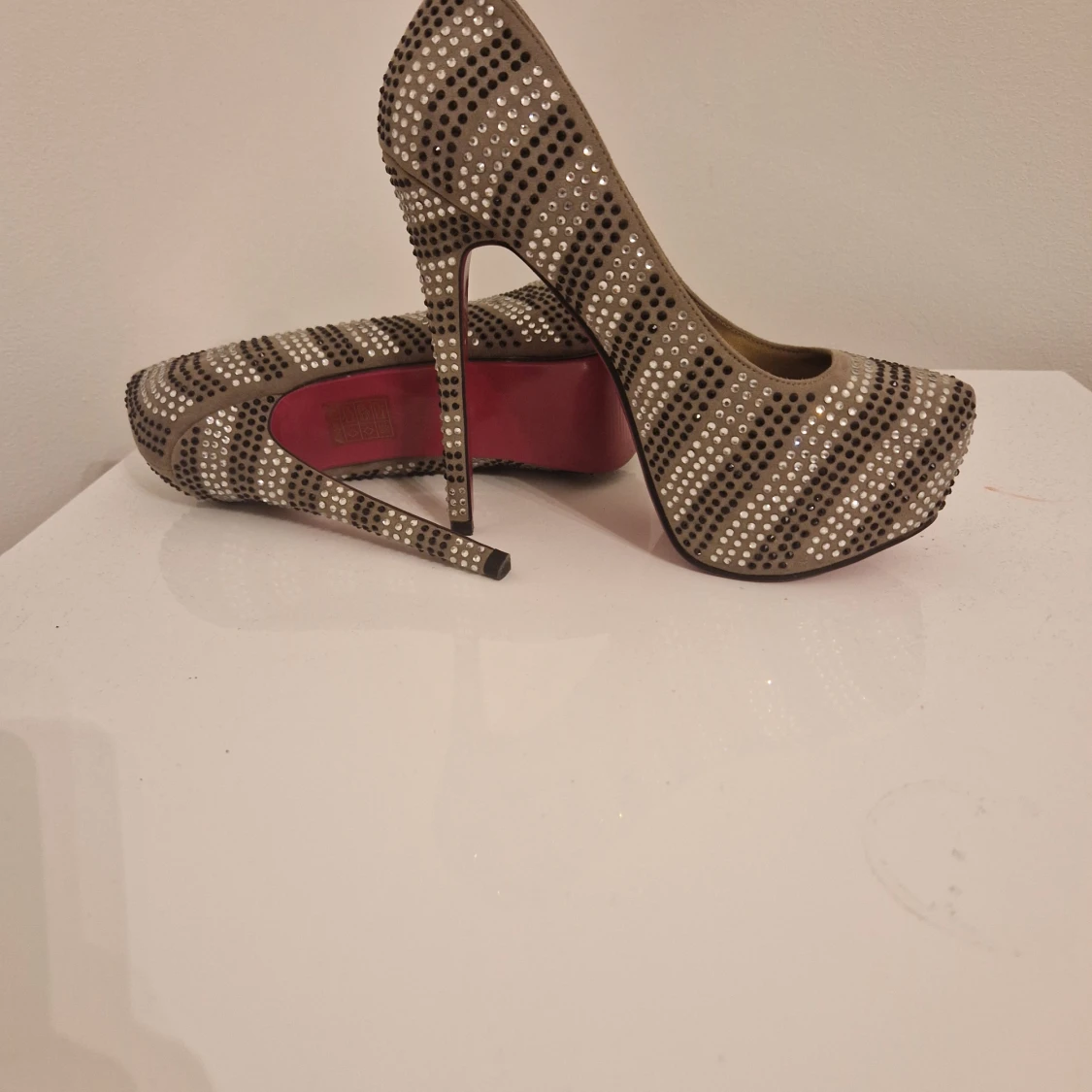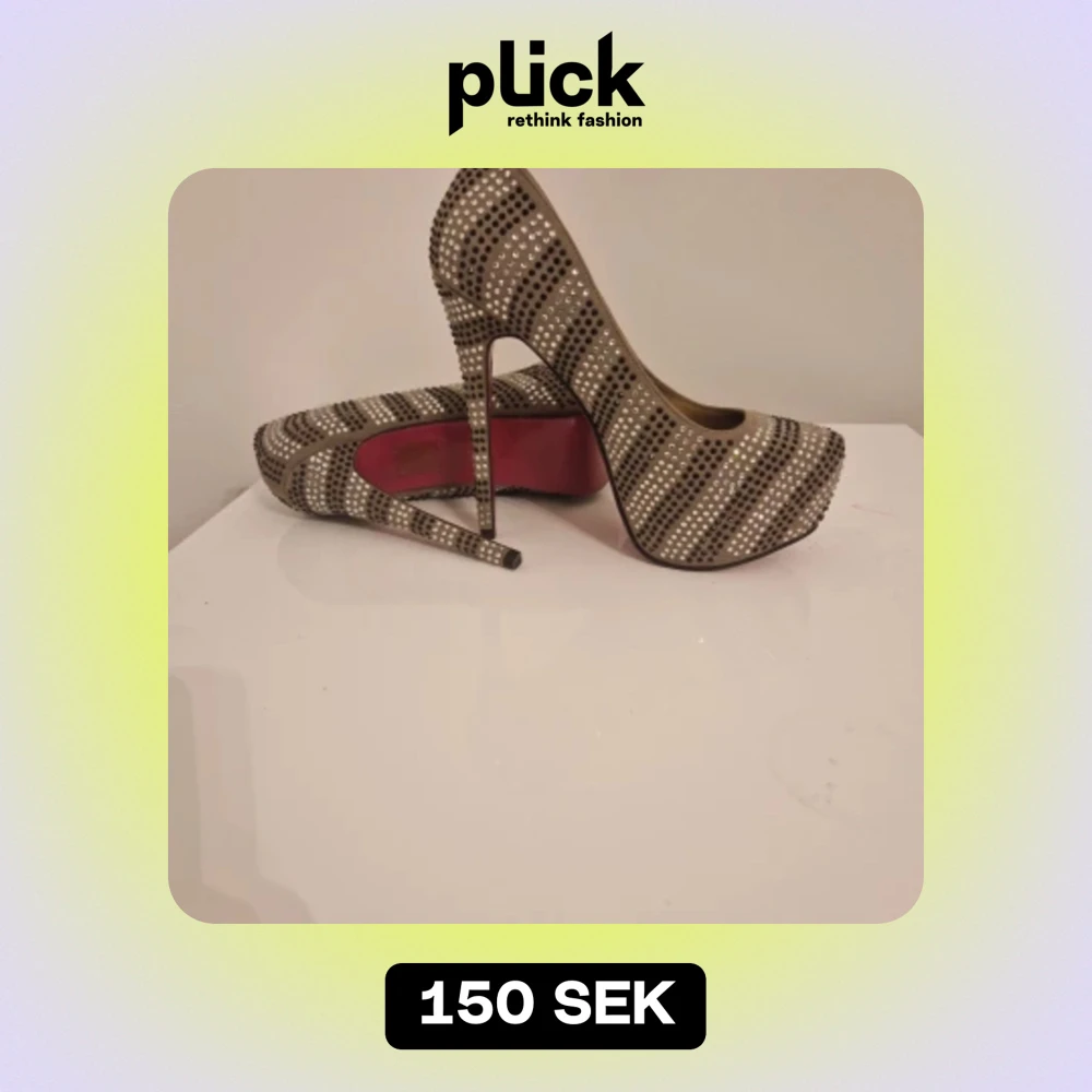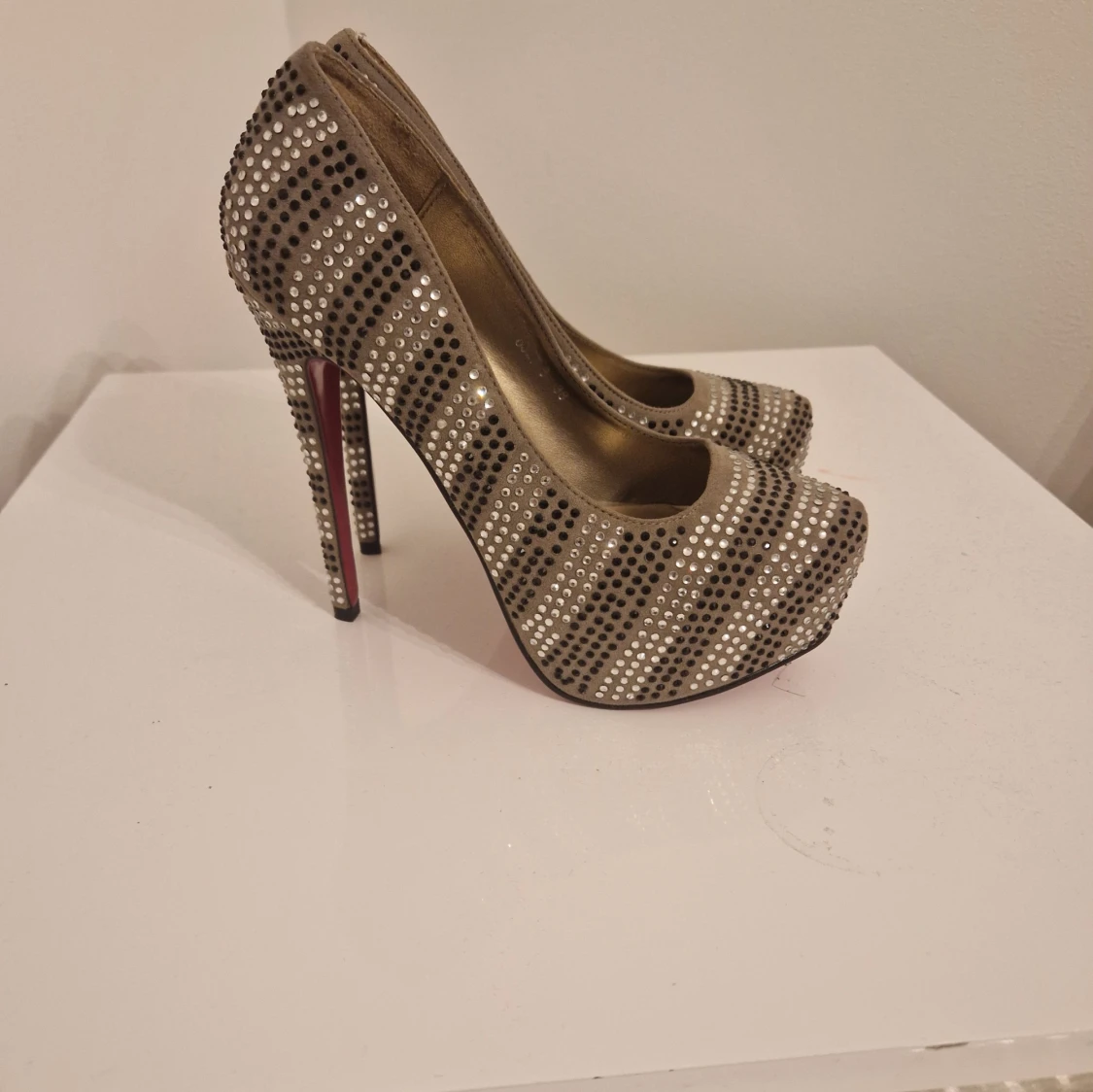 Säljer ett par superglittriga pumps med hög klack. De har en snygg randig design med massor av paljetter som verkligen fångar ljuset. Perfekta för en fest eller en utekväll när du vill sticka ut! Skorna har en spetsig tå och en elegant siluett.