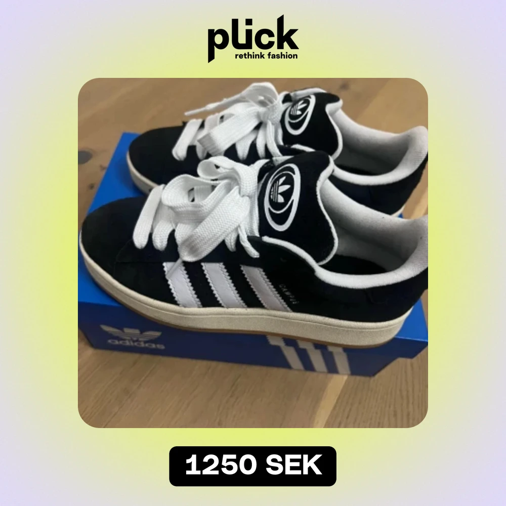 Adidas campus 00 i svart, nypris 1400kr. Endast använt en få antal gånger. Finns snören i svart färg med.