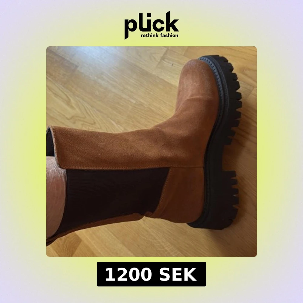 Säljer ett par snygga chelsea boots i brun mocka med svarta elastiska paneler på sidorna och kraftig, svart räfflad sula. Skorna har rund tå och platt sula, perfekt för dig som vill ha en cool och robust look till hösten eller vintern.Andvänt högst 2 gånger. Köpta i Milano.