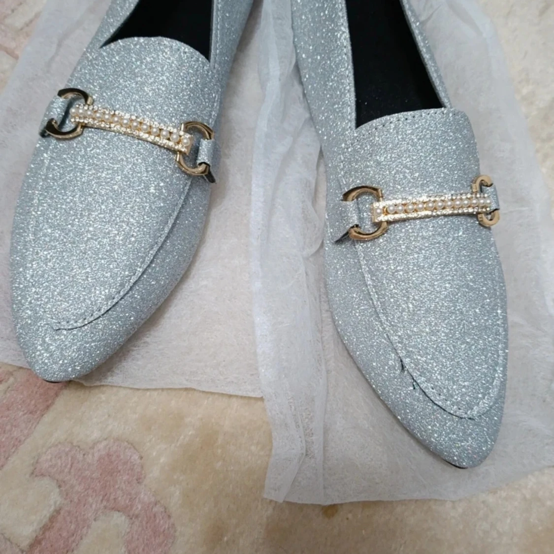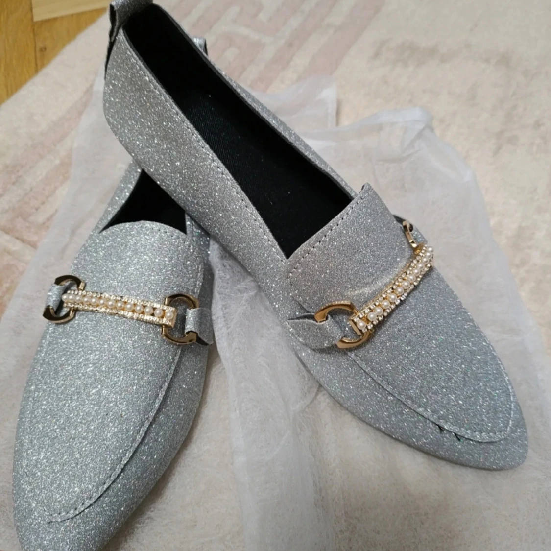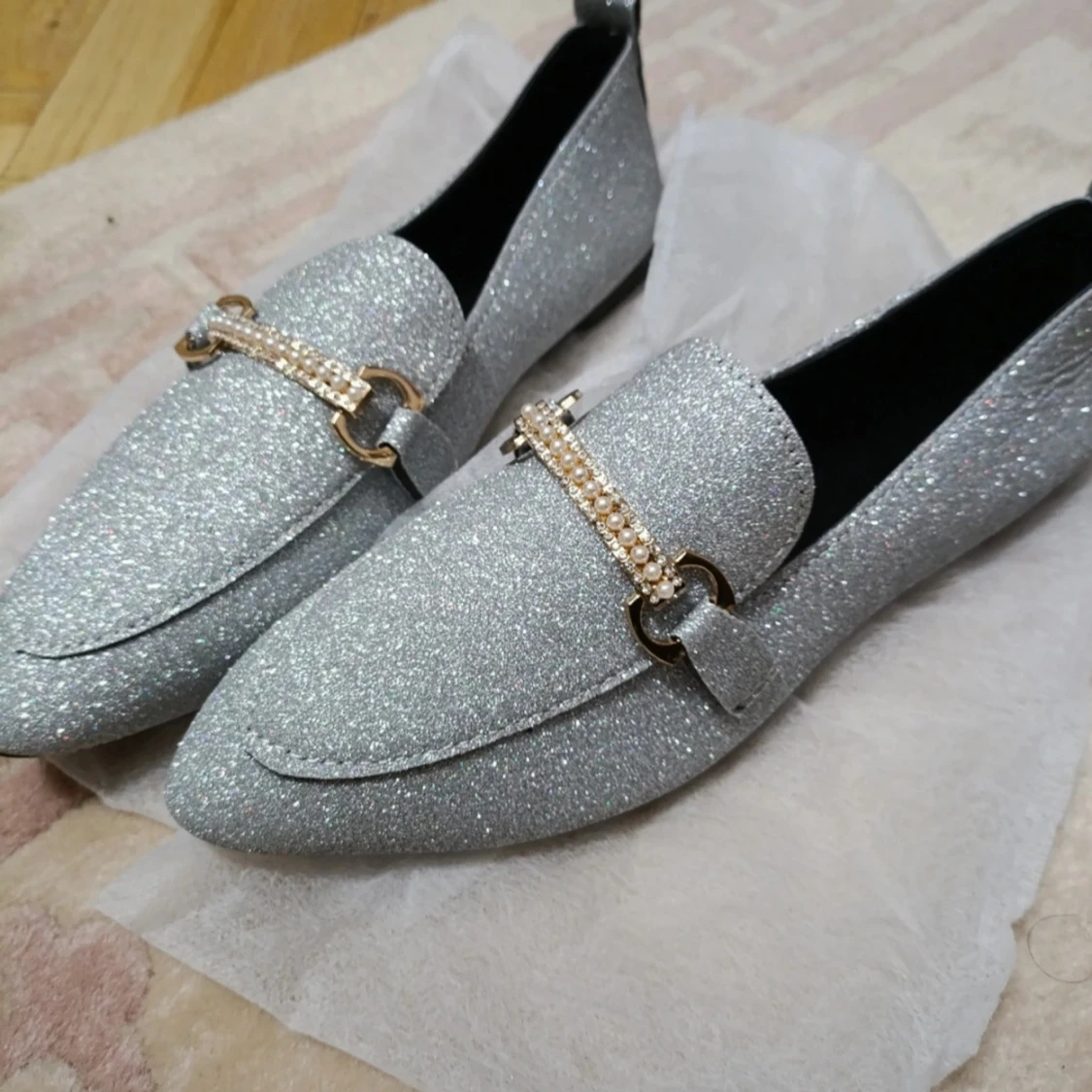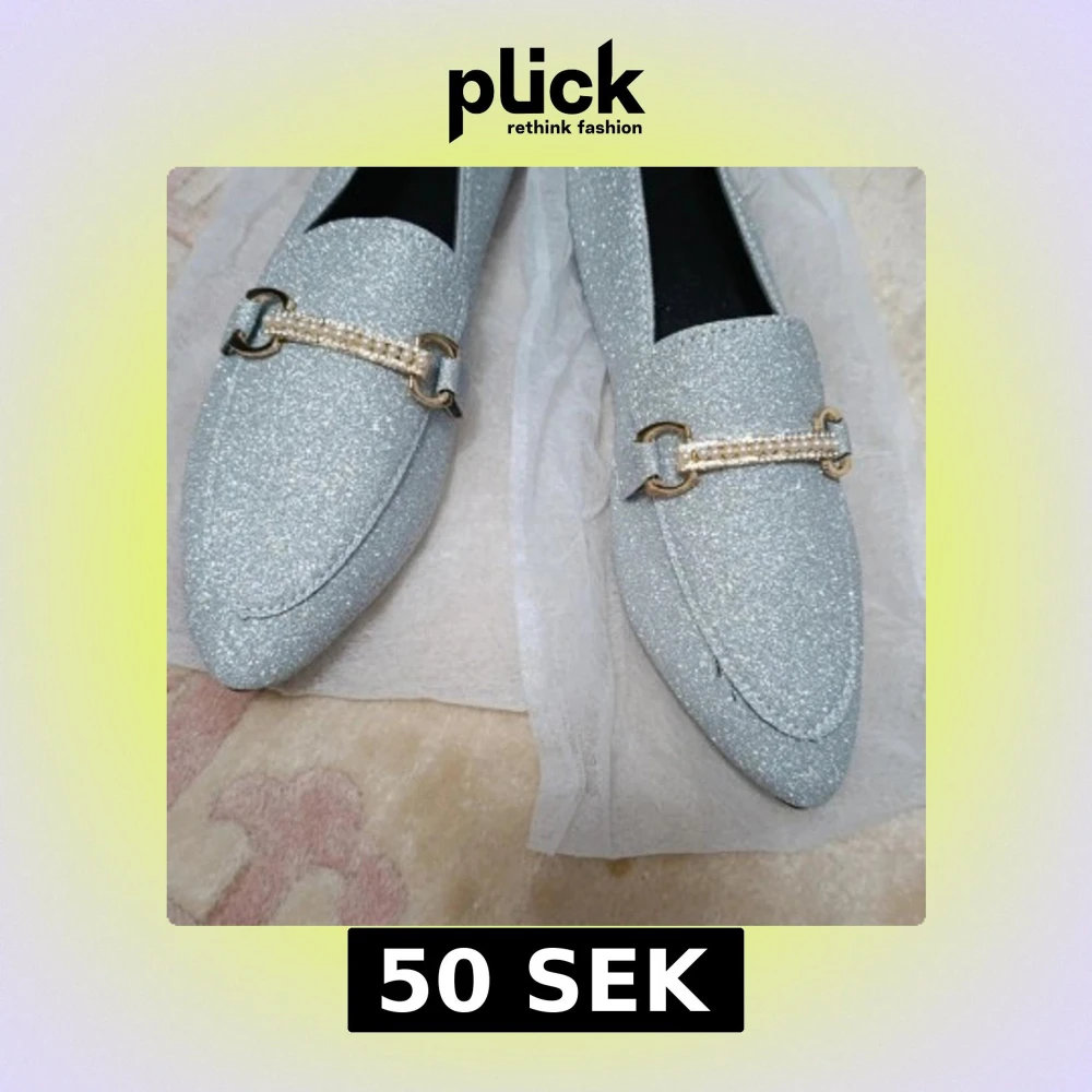 Snygga loafers i glittrigt silver med spetsig tå och platt sula. Dekorerade med guldfärgade spännen och pärlor framtill för extra bling. Perfekta för dig som vill sticka ut med stil och gillar glam. Skorna har en elegant form och passar till många olika looks.