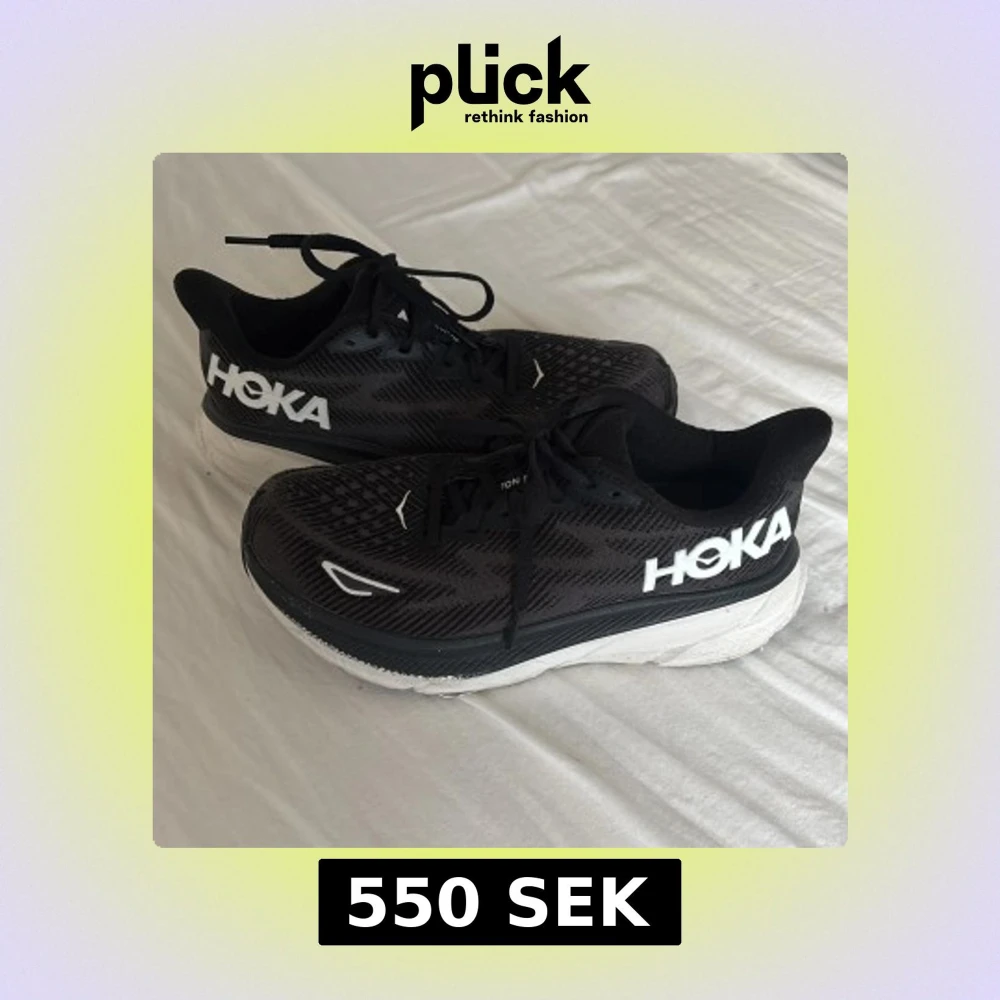 Säljer ett par svarta Hoka Clifton 9 sneakers med vit och svart tjock sula. Skorna har snörning och är tillverkade i syntetmaterial med ventilerande mesh-överdel. Hoka-loggan syns tydligt på sidan i vitt. Perfekta för dig som gillar att springa eller träna.