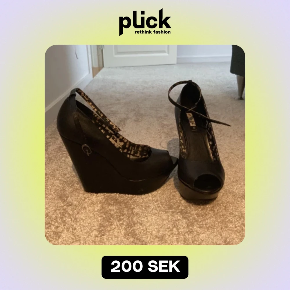 Säljer ett par snygga svarta kilklackar från XIT by Din Sko i storlek 38. Skorna har en öppen tå och ett justerbart ankelband för bättre passform. Insidan har ett coolt mönster i svart och vitt. Perfekta för fest eller en utekväll! 🖤