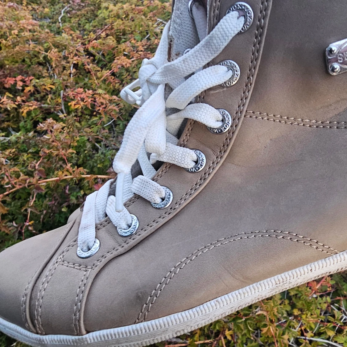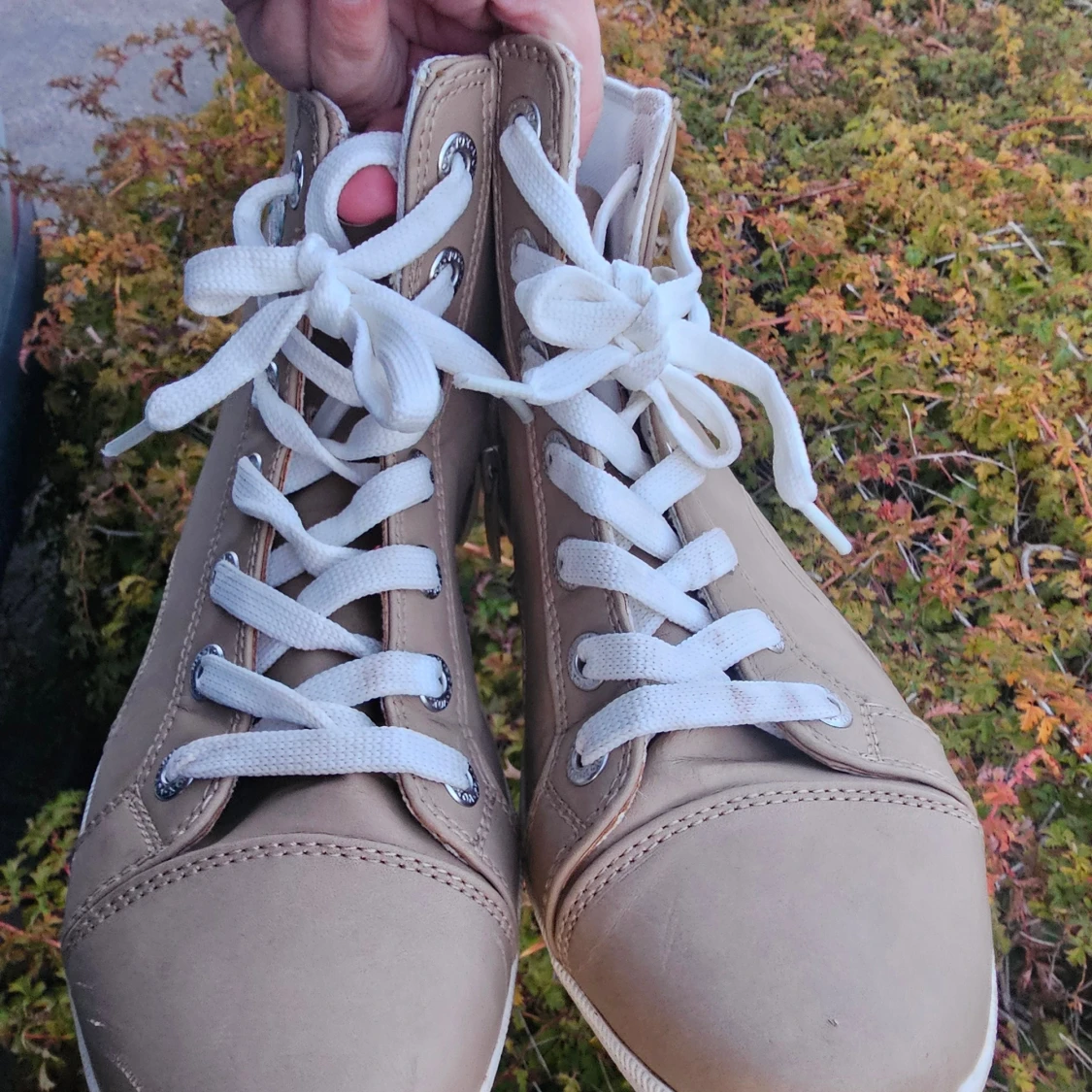 Snygga beige sneakers från Superfit med högt skaft och vita snören. Skorna har rund tå, platt sula och dragkedja på insidan för enkel på- och avtagning. Tillverkade i mjukt skinn med vita detaljer längs sömmarna. Perfekt för dig som gillar stilrena och bekväma skor.