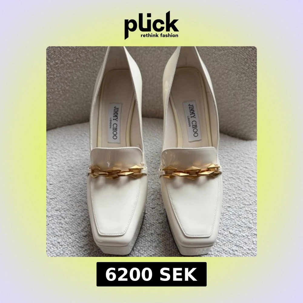 Säljer ett par eleganta vita platåpumps från Jimmy Choo med fyrkantig tå och chunky klack. Cremefärg. Skorna har en snygg guldfärgad kedjedetalj framtill och är tillverkade i blankt syntetmaterial. Perfekta för dig som vill sticka ut med elegans. 100% äkta. Inköpta i Jimmy Choo butiken i Paris. Använt dem enbart 2-3 ggr.