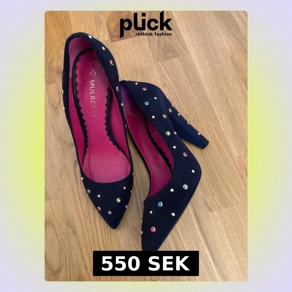 Mulberry Pumps, Navy, suede, 38 Eleganta mörkblå pumps från Mulberry i storlek 38. Skorna har en spetsig tå och är dekorerade med färgade nitar. Perfekt för festliga tillfällen! Använda en gång och är i topp skick. Titta gärna på mina andra annonser!
