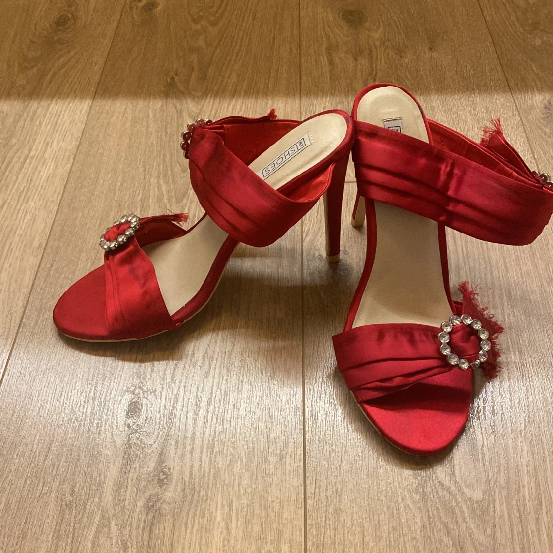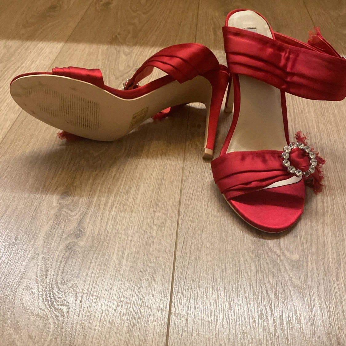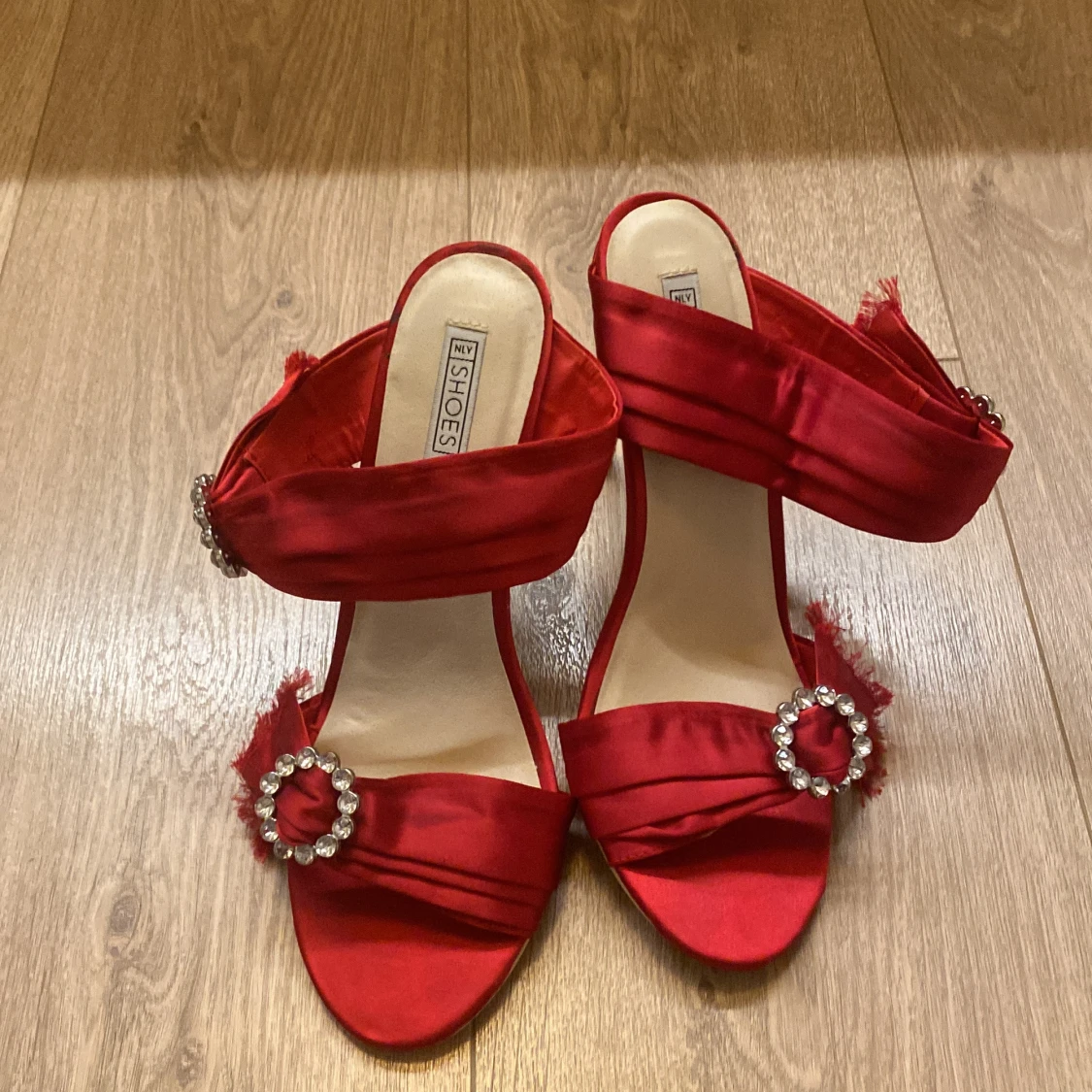 Röda pumps med strassdetalj