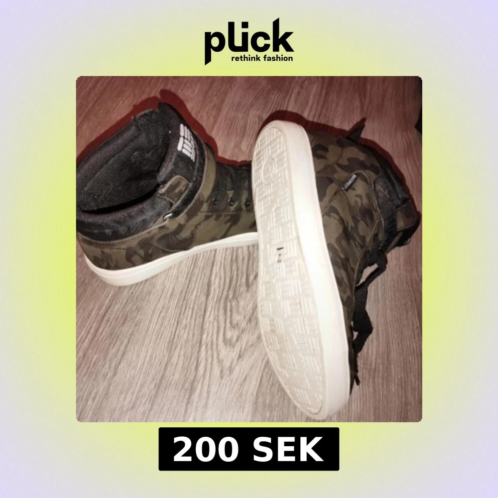 Snygga sneakers i kamouflagemönster med svarta snören och en vit sula. Skorna har en hög modell med kardborreband för extra stöd. Perfekta för en cool och avslappnad stil.
