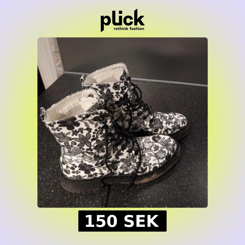 Snygga kängor med ett unikt svartvitt blommönster. De har snörning framtill och en robust sula som ger bra grepp. Sparsamt använda. Tvättar såklart innan jag skickar dem.