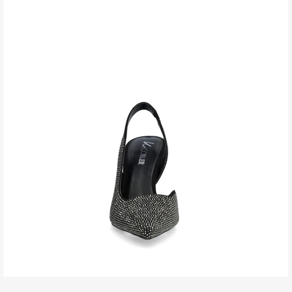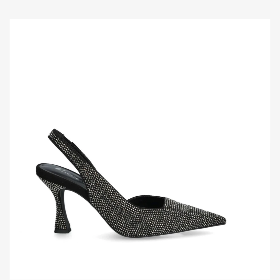 Snygga svarta pumps med glittriga stenar över hela skon. Modellen har en spetsig tå, öppen häl och elegant hög klack. Perfekta för dig som vill sticka ut med en glamorös look. Skon har en smal siluett och klassisk form.