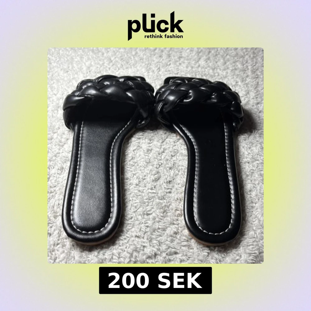 Stilrena svarta sandaler med bred, flätad rem över foten och trendig fyrkantig tå. Tillverkade i syntetmaterial med mjuk känsla och kontrastsömmar längs sulan. Liten i storleken men perfekta för en chill sommarlook eller när du vill ha något enkelt men snyggt.