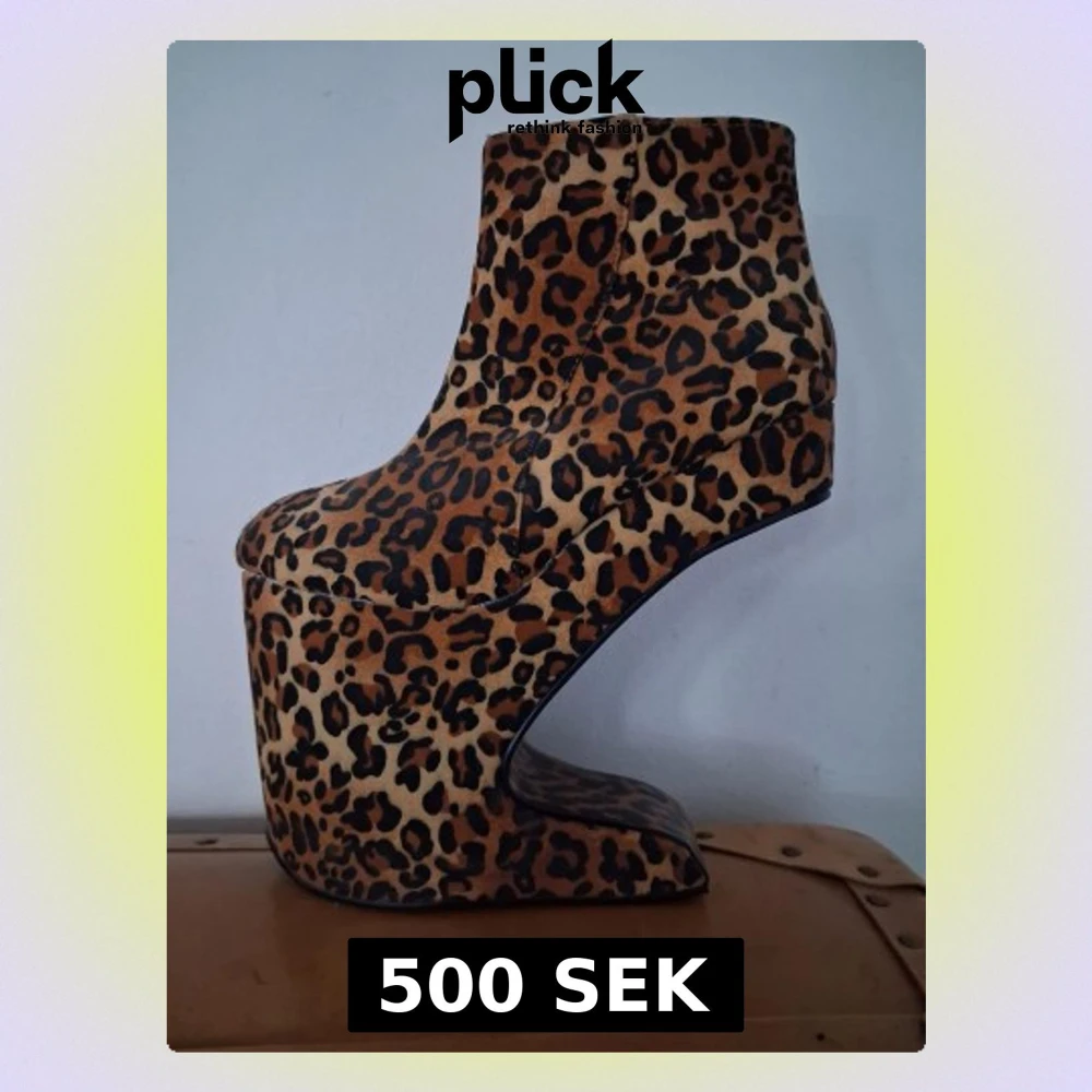 Unika platåskor med kilklack och leopardmönster. Skorna har rund tå, hög platåsula och dragkedja på sidan. Materialet är troligtvis syntet med sammetskänsla. Perfekta för dig som vill sticka ut och älskar djurmönster.