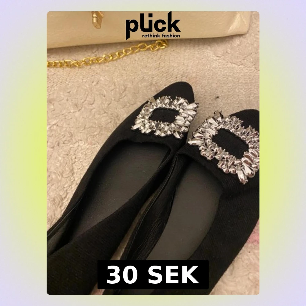 Snygga svarta ballerinaskor med spetsig tå och stora glittriga strasspännen framtill. Skorna har en elegant och klassisk look, perfekta för att lyfta vilken outfit som helst. Materialet är textil med en mjuk känsla och insidan är svart.