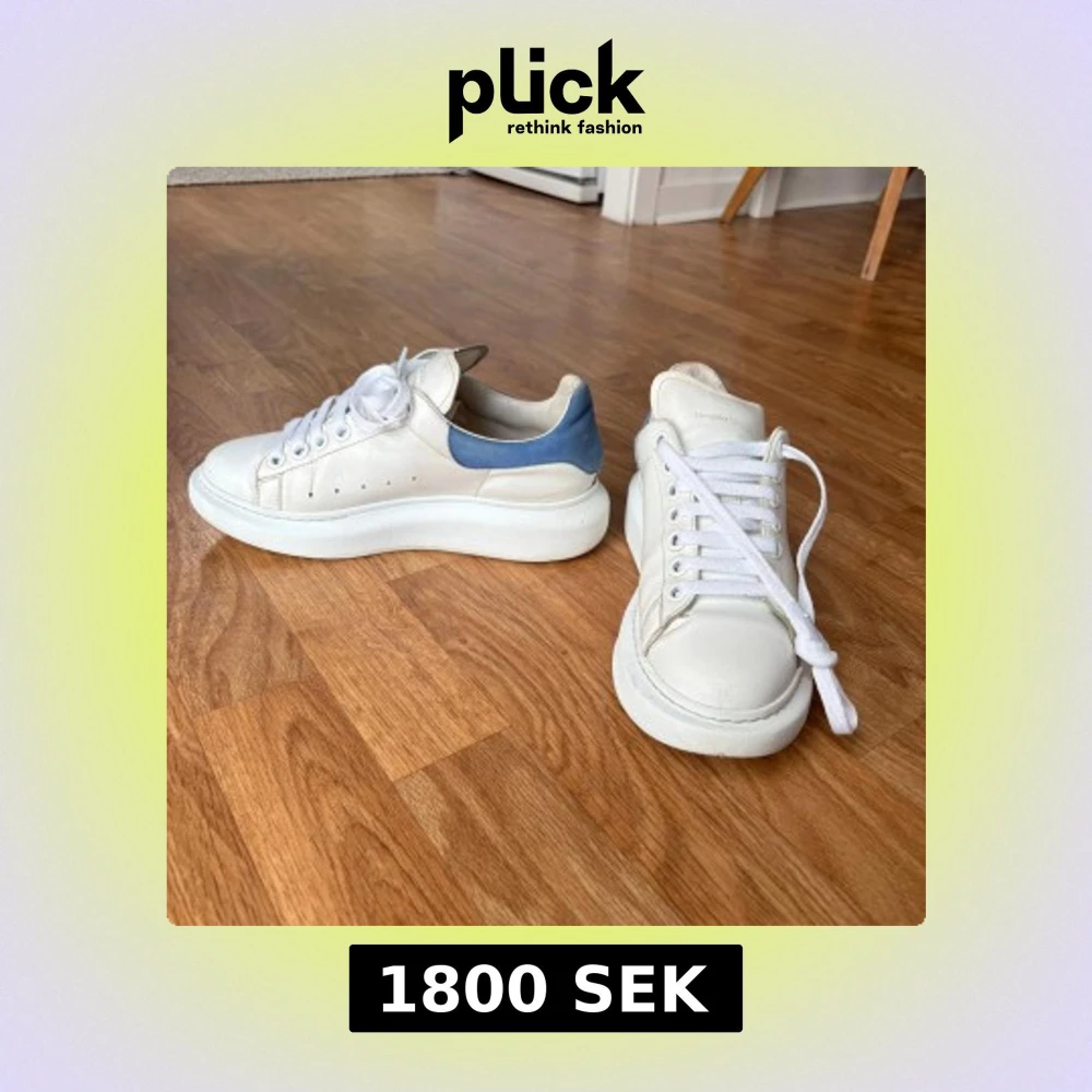Vita sneakers från Alexander McQueen. Blå mockadetalj och silvertryckt logotyp vid hälen. Finns mindre skavanker, se bilder. Skosnören är nya, men skickar även med de gamla. Sulhöjd: 3,5 cm.