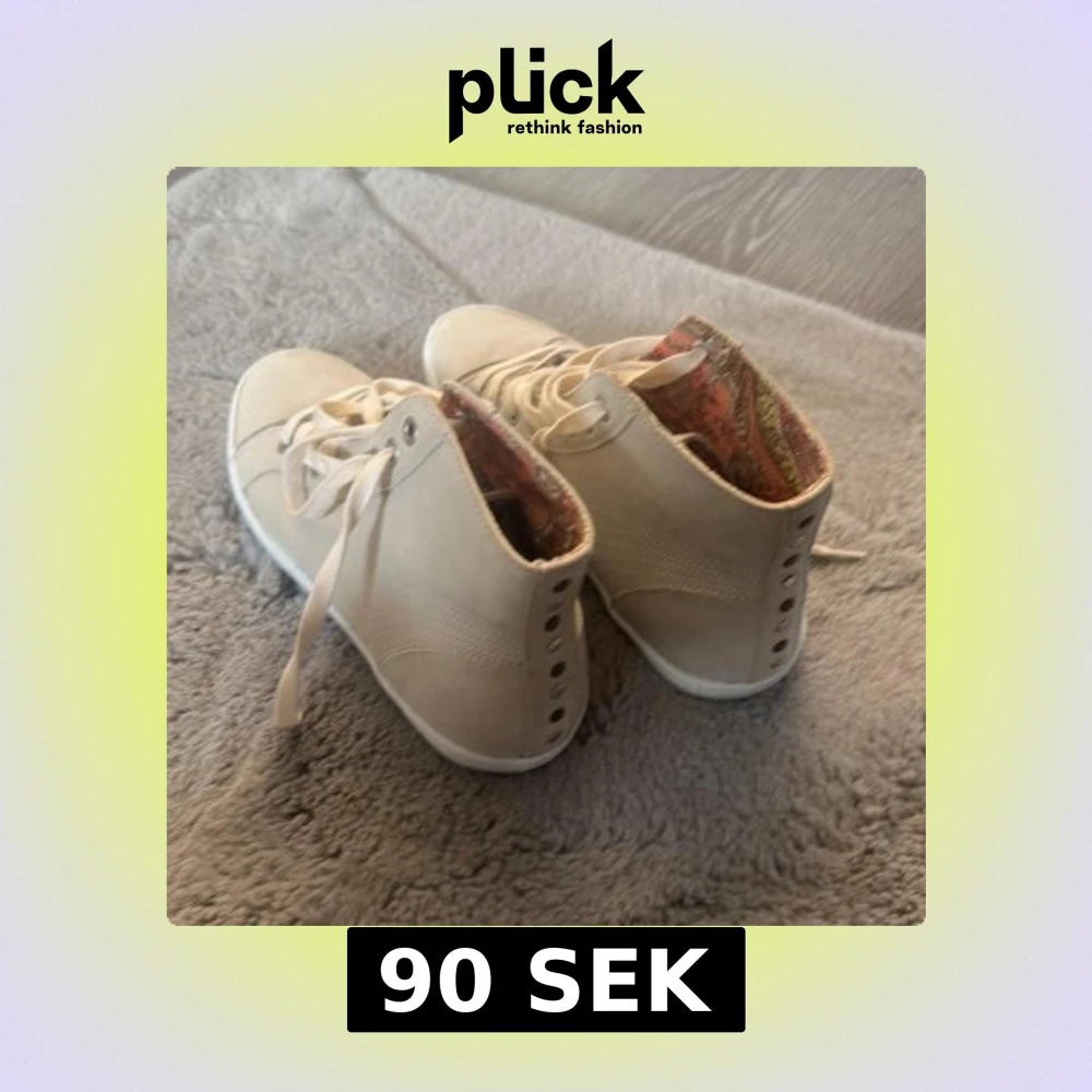 Snygga höga sneakers i beige med snörning och rund tå. Skorna har ett färgglatt mönstrat innerfoder som ger en unik touch. Aldrig använda men köpta vinted därav ingen strl o märke men strl skulle jag säga 37-38