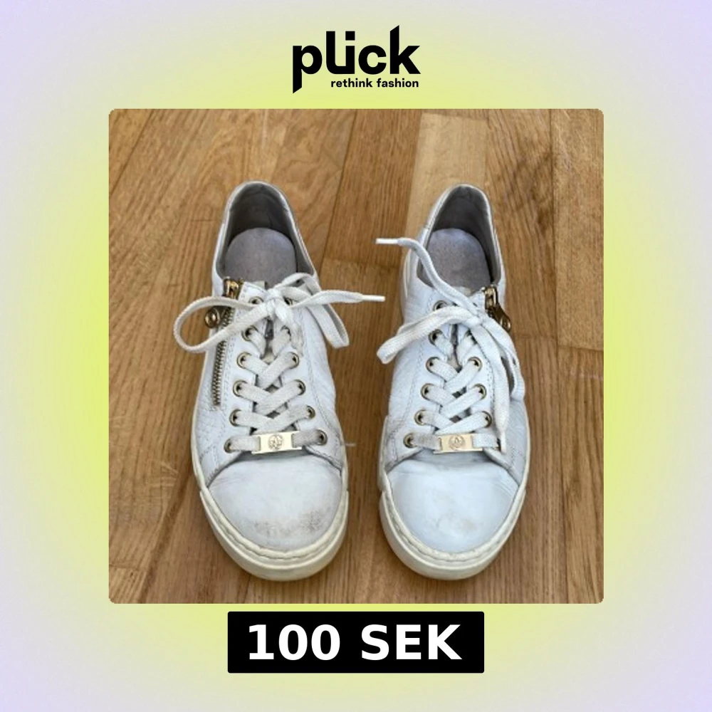 Säljer ett par välanvända skor från rieker i storlek 38. Skorna är vita med guldfärgade detaljer. Det är väldigt välanvända och därmed lite smutsiga med fläckar som tyvärr inte går bort så enkelt, men det fyller fortfarande sin funktion. Ena skon har även en större fläck på undersidan och sen förekommer även små fläckar och slitage på åvansidan.
