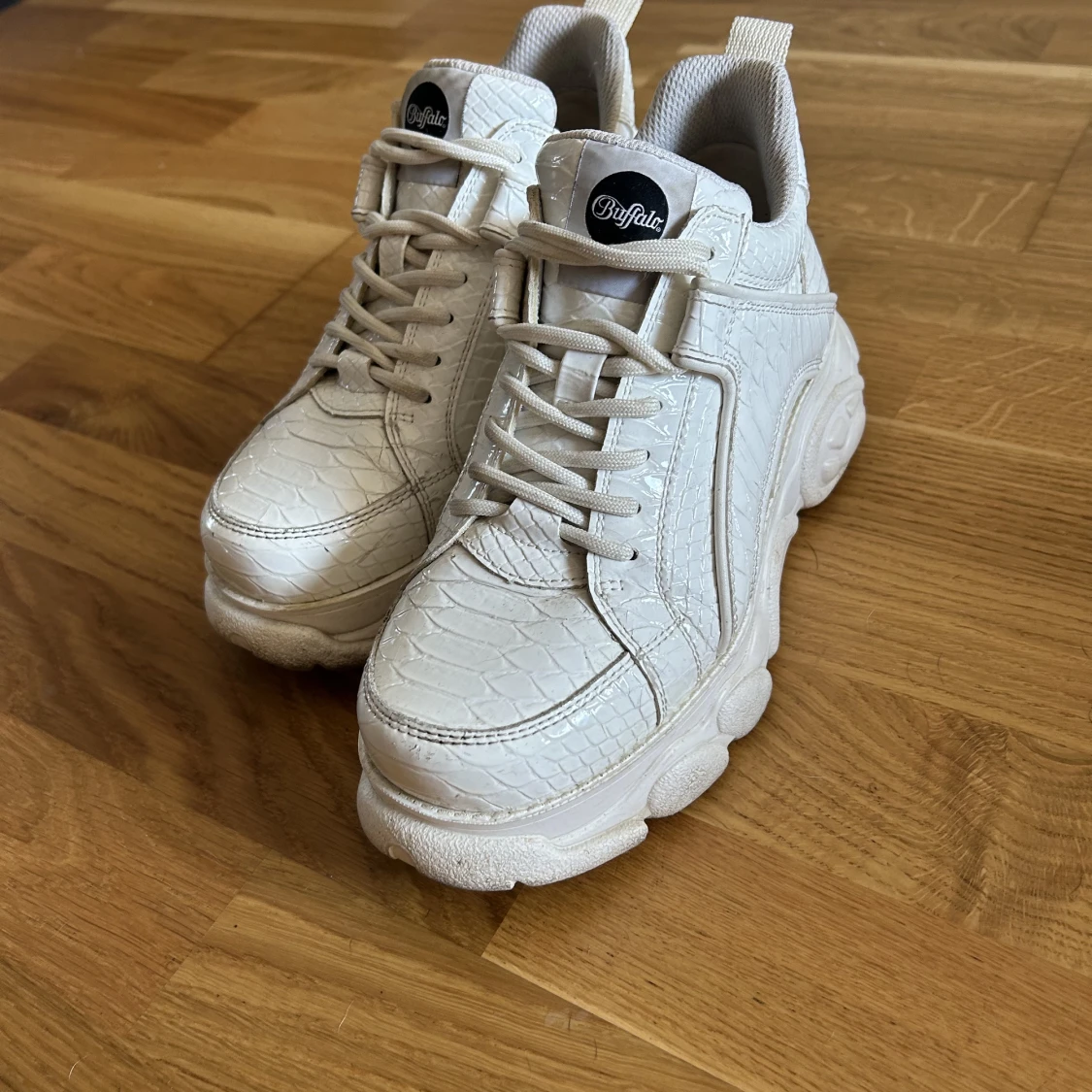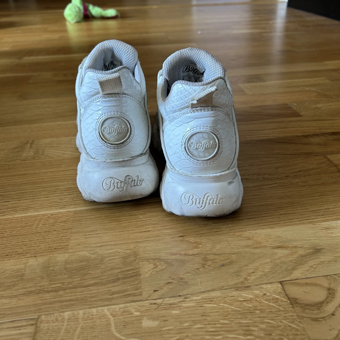 Vita buffalos i storlek 38. De är använda och har ett litet svart märke bak som inte går bort men annars fina. 450+eventuell frakt eller bud