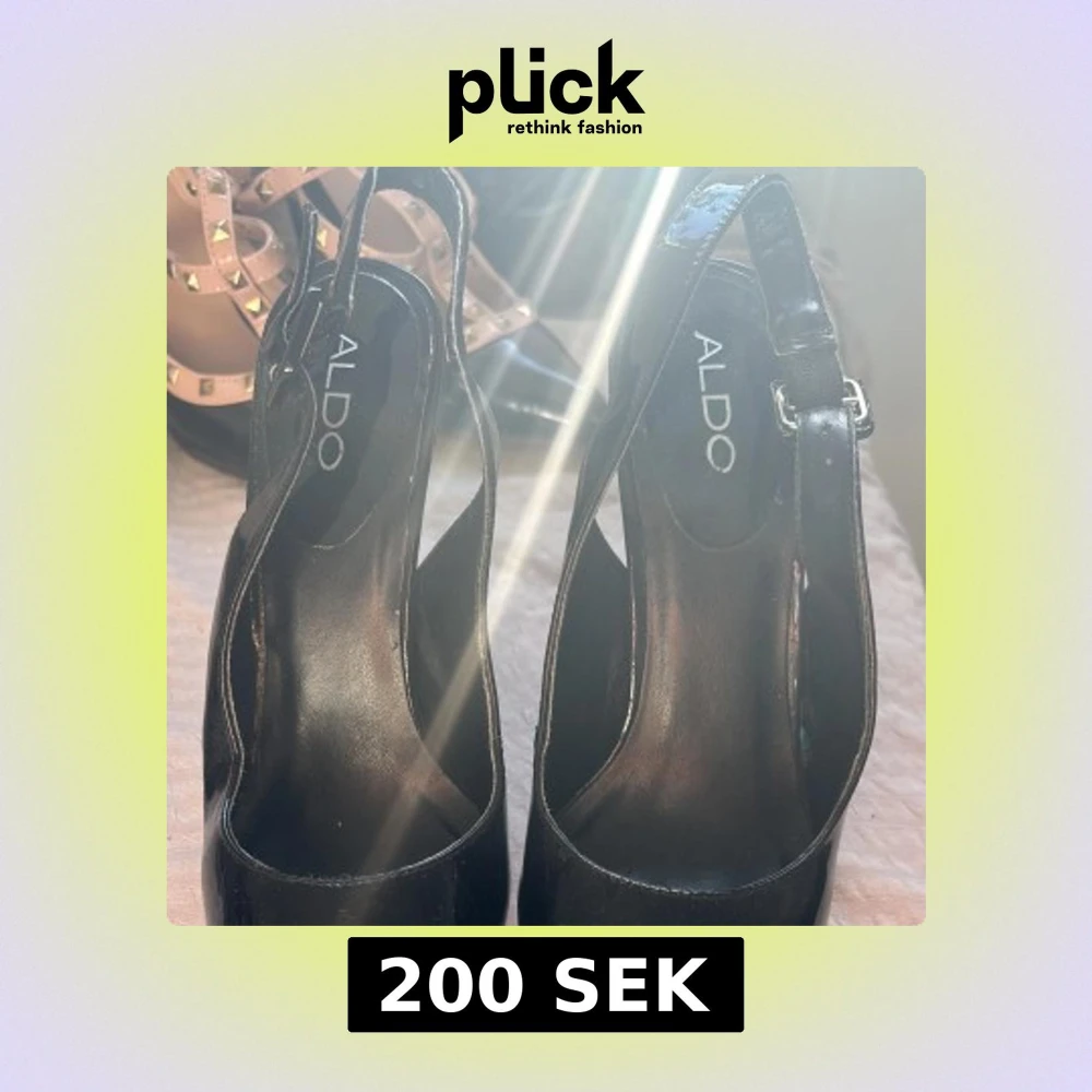 Säljer ett par svarta pumps från ALDO i glansigt lackmaterial. Skorna har en smal rem runt hälen och hög klack. Perfekta för dig som vill ha en klassisk och elegant look.