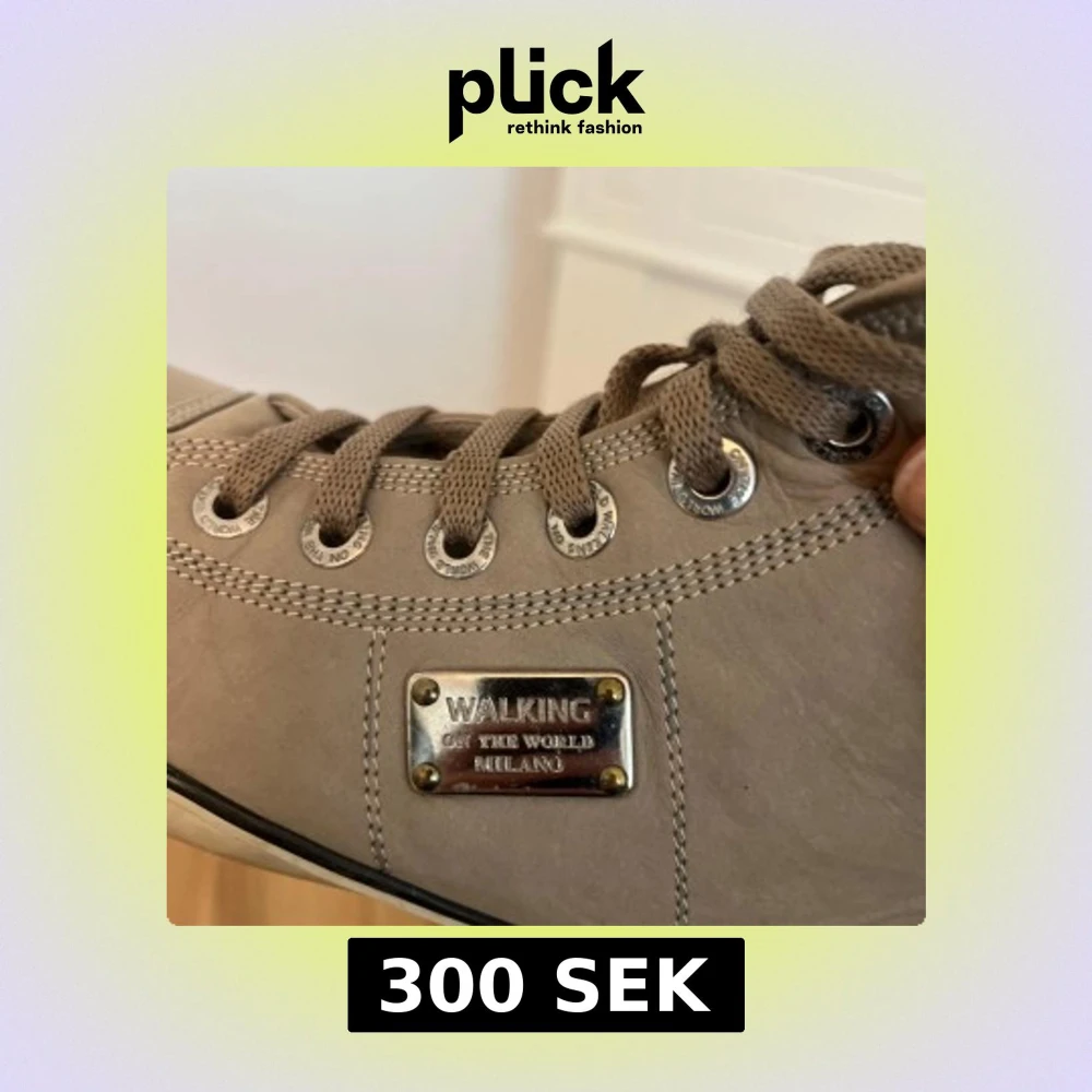 Snygga beige sneakers från Walking Milano med högt skaft och rund tå. Skorna har snörning med metallöglor och en cool metallplatta med logga på sidan. Tillverkade i skinn med detaljerade sömmar och platt sula. Perfekt för dig som gillar stilrena och neutrala färger.