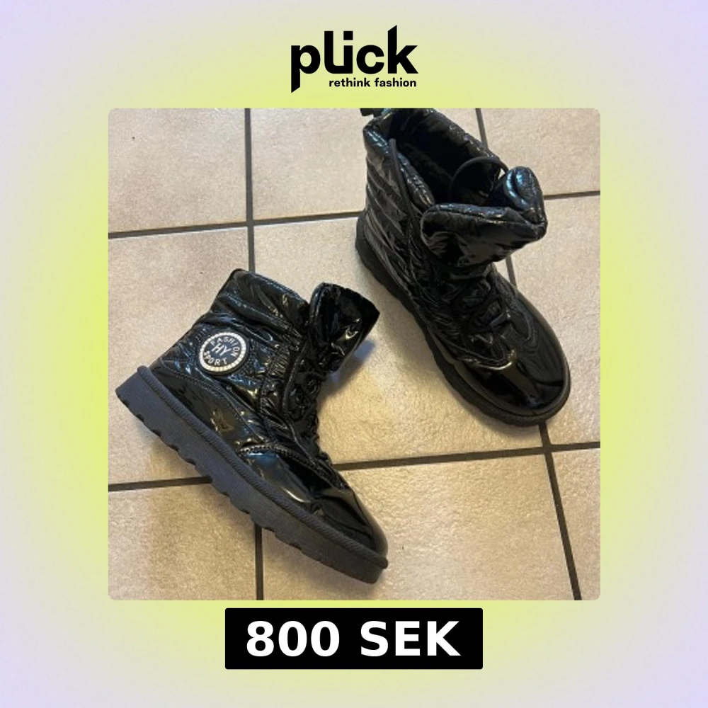 Moon boots i glansigt svart syntetmaterial med grov platt sula och snörning framtill. De har quiltad yta och rund tå, samt en tydlig HY Sport-logga på sidan. Perfekta för dig som vill ha chunky vinterstil och hålla värmen.