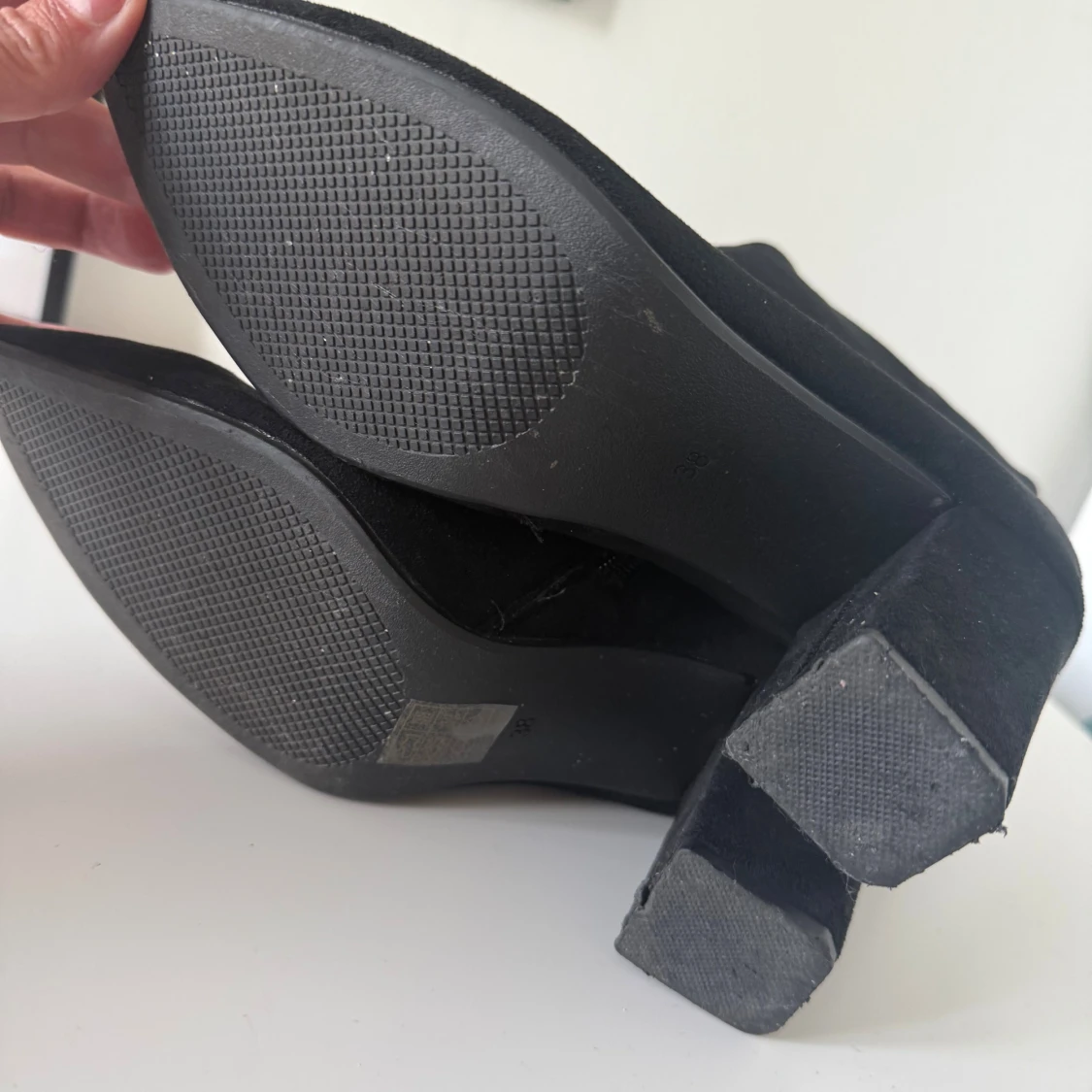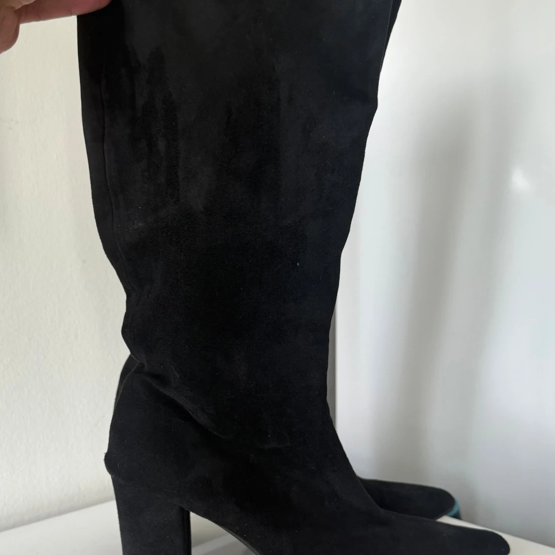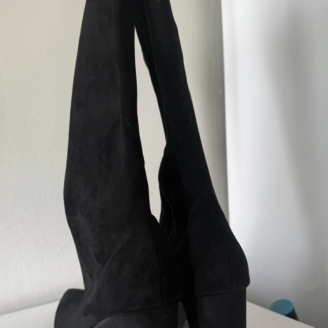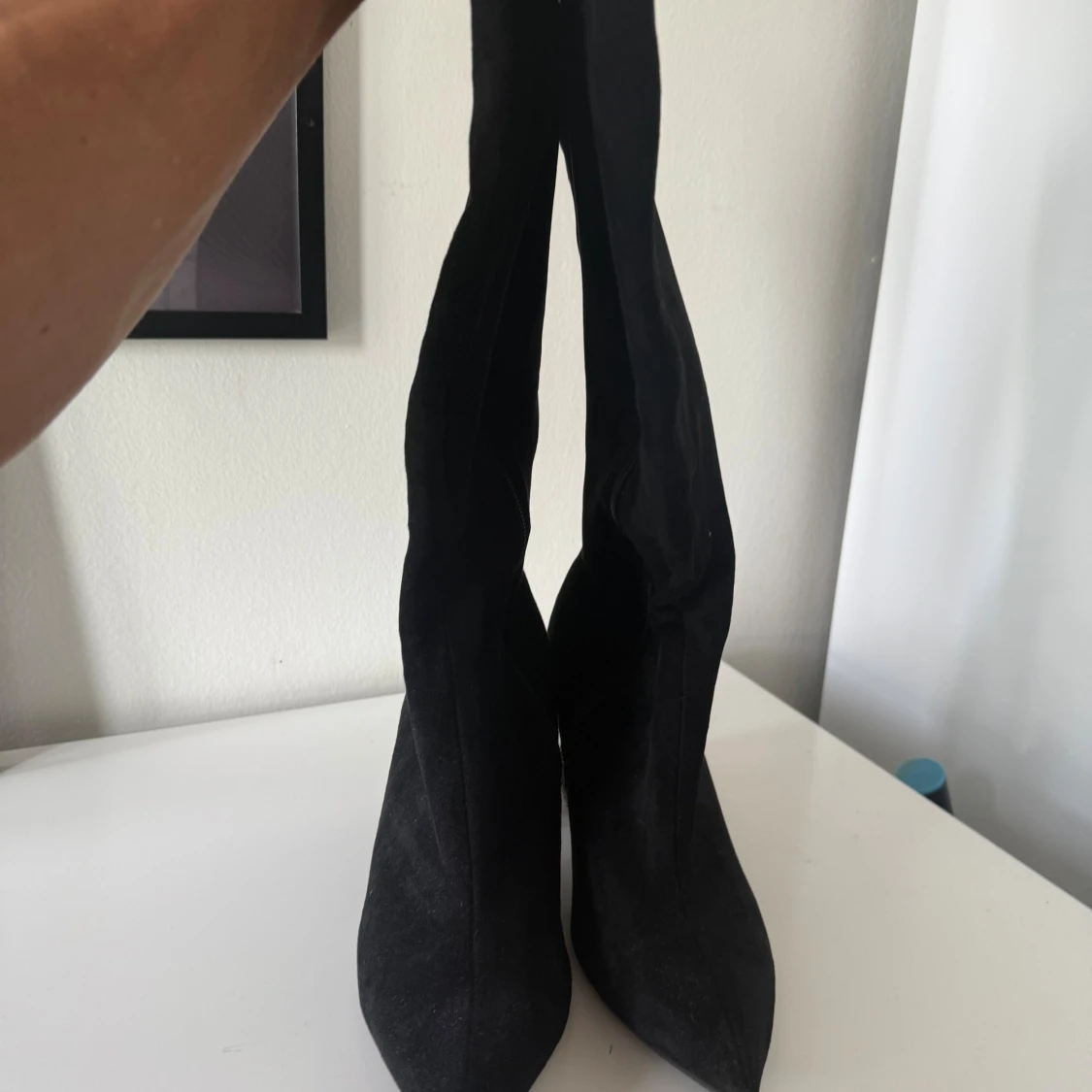 Säljer ett par svarta stövlar i fuskmocka med hög klack 8cm och spetsig tå. De når upp under knät. Sula i syntetmaterial. Skaftvidd 40 cm. Strl 38. Mycket fint skick!