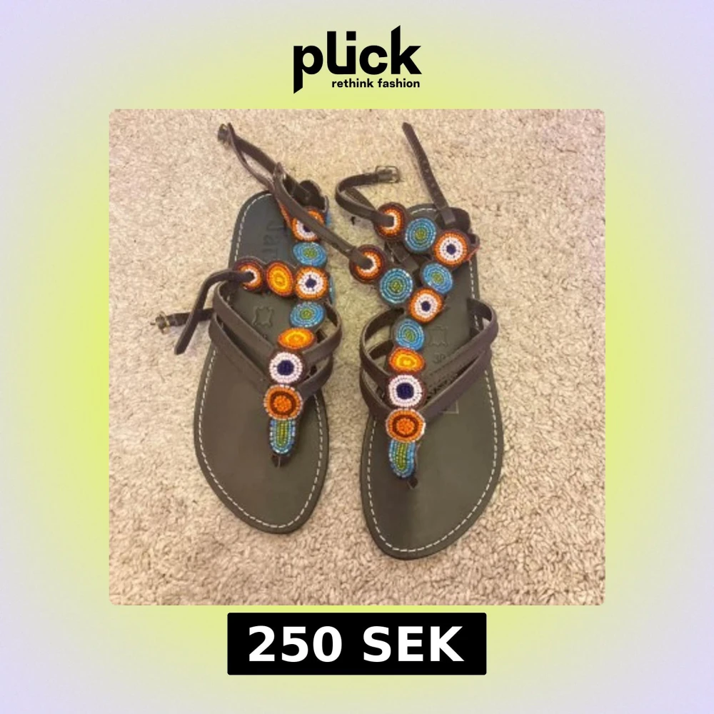 Unika bruna sandaler med färgglada pärlor i blått, orange, vitt och grönt. Remmarna är i skinn och sandalerna har öppen tå och platt sula. Perfekta för varma dagar och ger en bohemisk touch till din outfit.