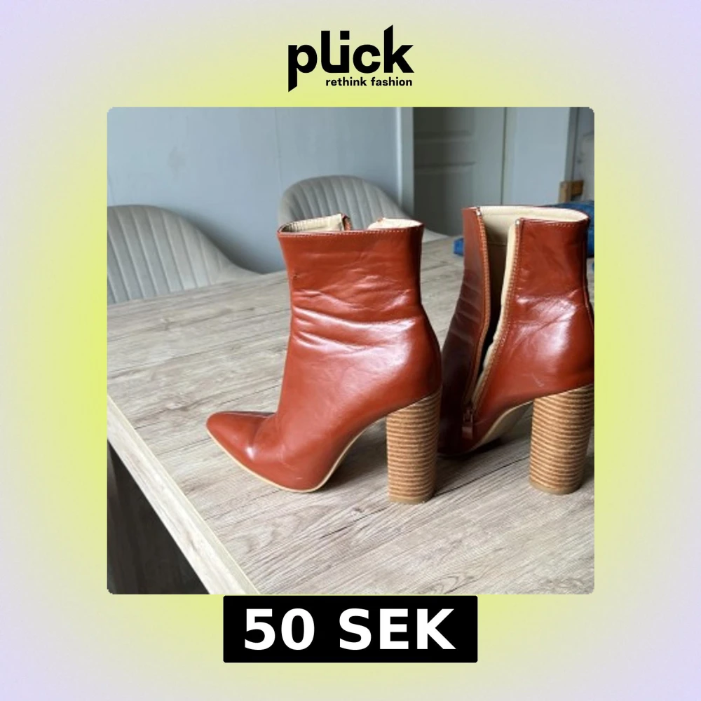 Snygga bruna stövletter i skinn med en elegant spetsig tå och dragkedja på sidan. De har en robust klack som ger extra höjd och stil. Perfekta för att lyfta vilken outfit som helst.