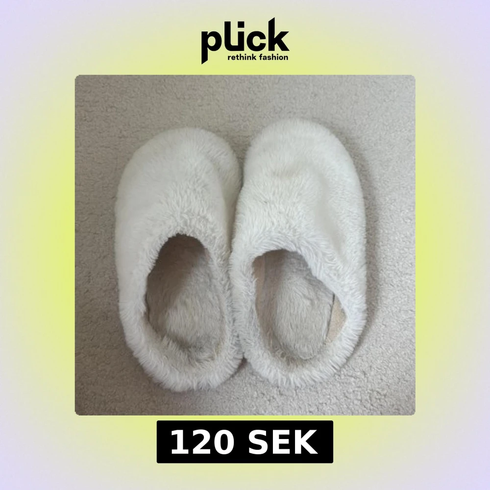 Mysiga vita tofflor med fluffig yta och mjuk insida. De har en enkel slip-in design och platt sula, perfekta att glida i hemma. Utsidan är täckt av syntetiskt pälsmaterial som ger en riktigt cozy känsla.