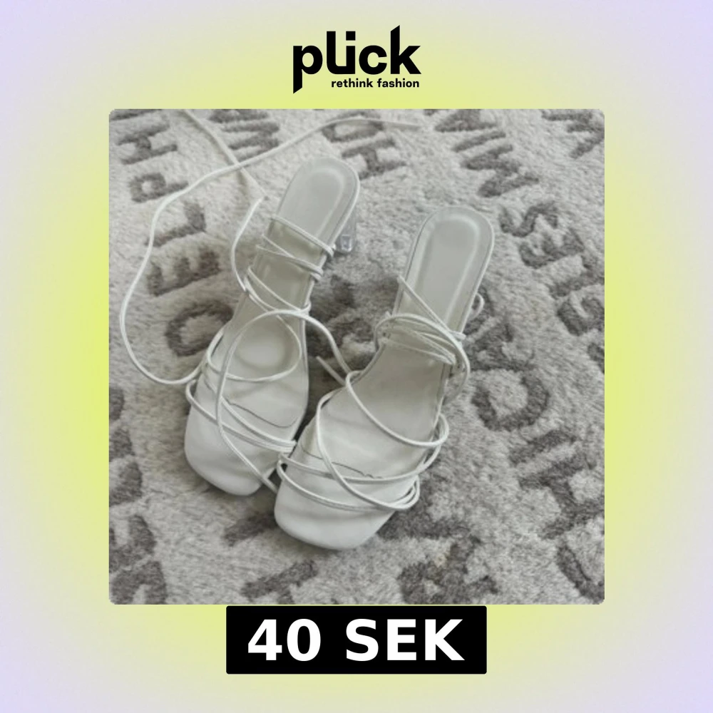 Säljer ett par trendiga vita sandaler med smala remmar och fyrkantig tå. Skorna har en cool transparent blockklack och långa snören som kan lindas runt benet. Perfekta för att lyfta vilken outfit som helst med sin stilrena och moderna look.
