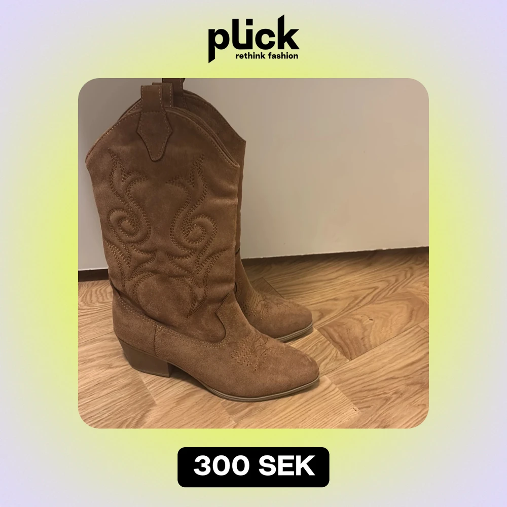 Snygga bruna cowboy boots i mocka med broderade detaljer. De har en låg klack och spetsig tå, perfekt för en stilren look. Passar både till vardags och festliga tillfällen. Skorna är i mycket bra skick och redo att användas direkt! Skorna är köpa i Istanbul. Aldrig använda.
