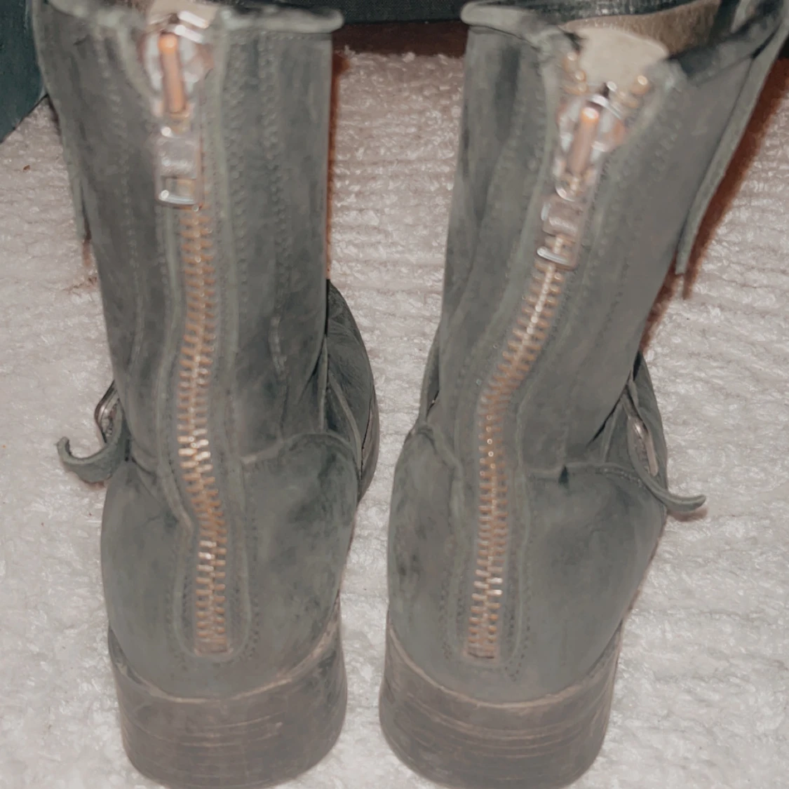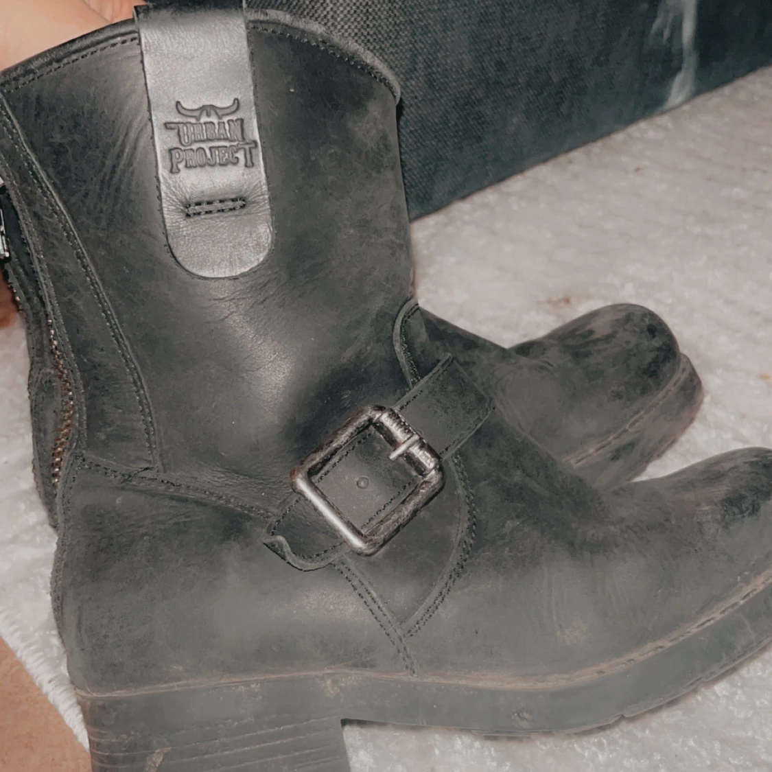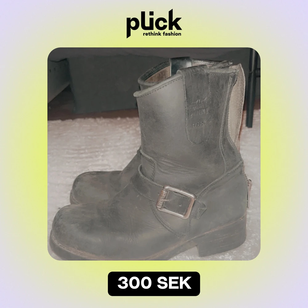 Säljer ett par svarta boots i skinn med coola detaljer som dragkedja bak och ett snyggt spänne på sidan. Perfekta för höst och vinter, de har en robust klack och är i bra skick. Passar både till vardags och lite tuffare outfits.