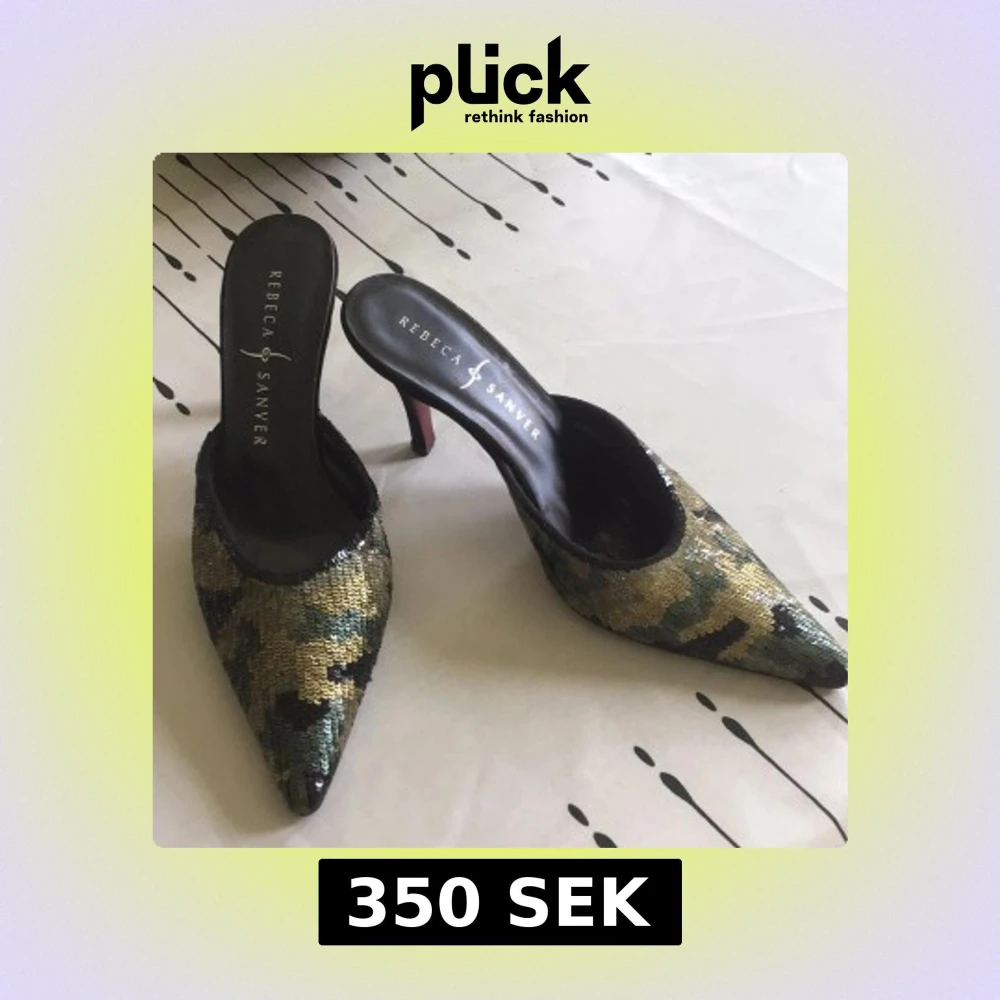 Unika pumps med spetsig tå från Rebeca Sanver, täckta i glittriga paljetter i camouflage-mönster. Skorna har hög klack, öppen häl och svart innersula. Perfekta för dig som vill sticka ut med en edgy och glam look.