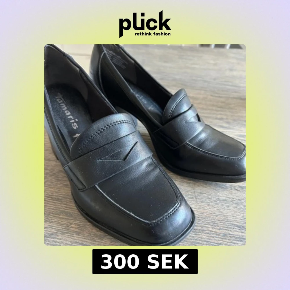 Stilrena svarta loafers från Tamaris i skinn med chunky klack och klassisk pennyloafers-detalj framtill. Snyggt minimalistisk design med rund tå och markerad sula, perfekta för dig som vill ha en dressad look med lite edge.