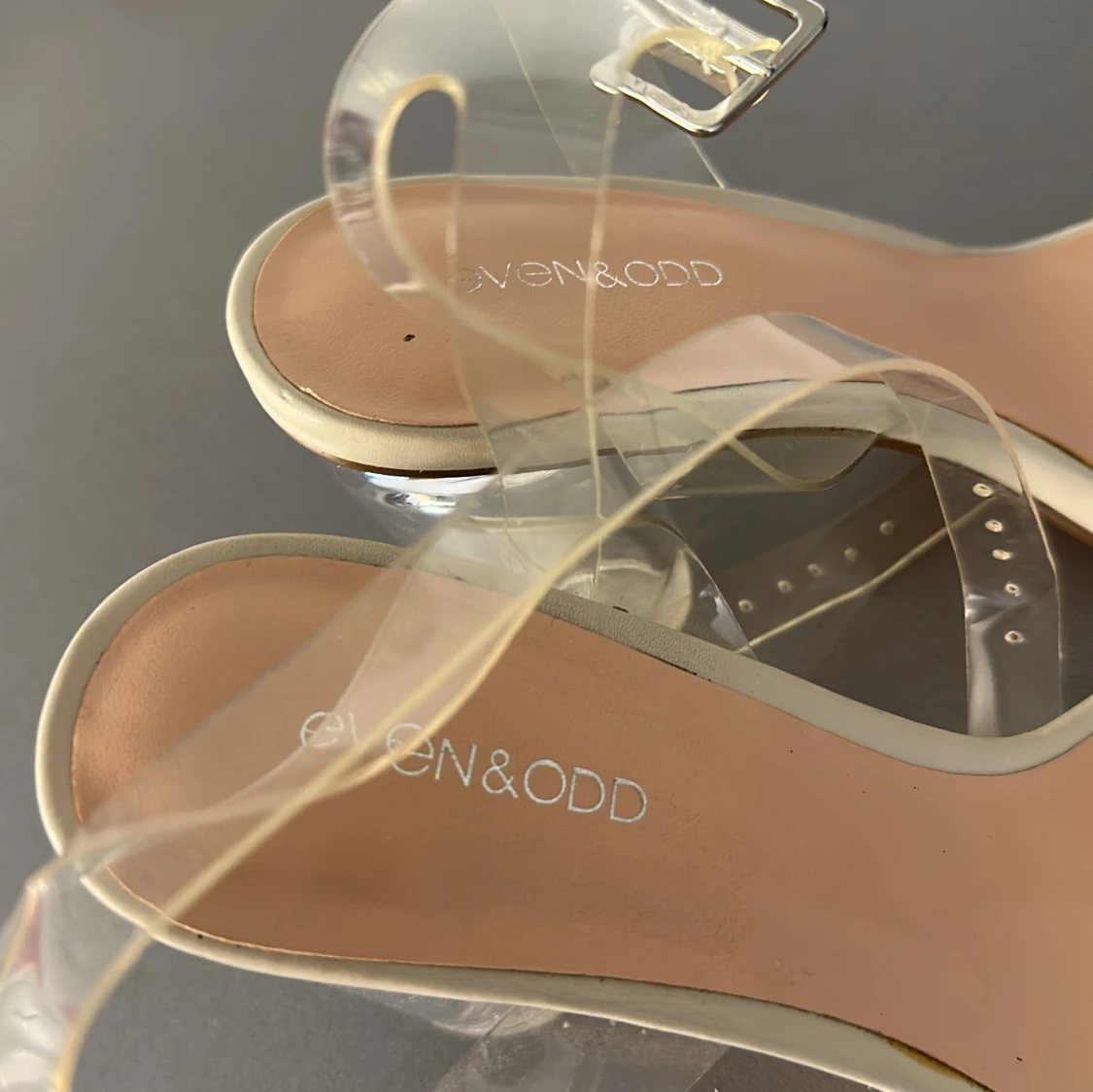 Säljer ett par trendiga transparenta klackskor från Even&Odd. Skorna har genomskinliga remmar och en rund, genomskinlig klack. Perfekta för dig som vill ha en stilren och modern look.