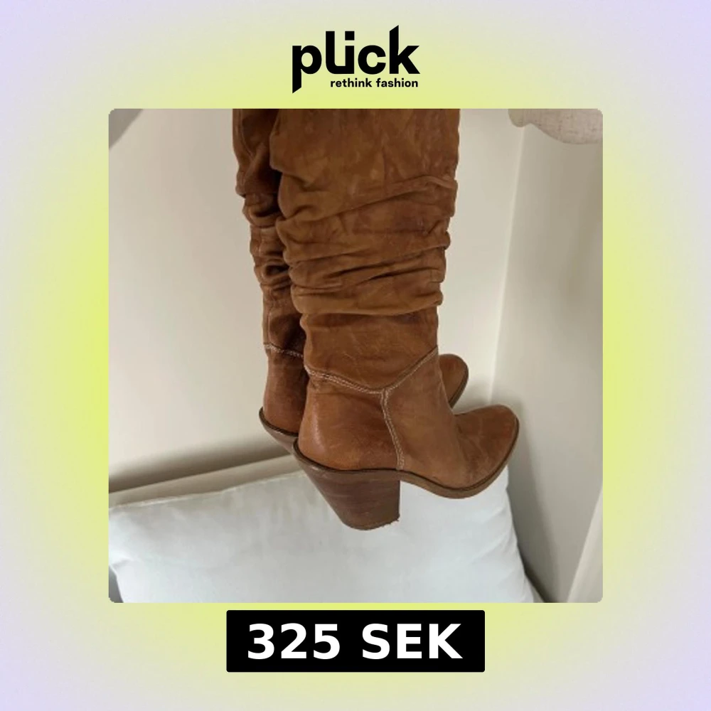 Säljer ett par snygga bruna boots i skinn med slouchy skaft och markerad klack. De har rund tå och en klassisk western-inspirerad look som passar perfekt till jeans eller klänning.