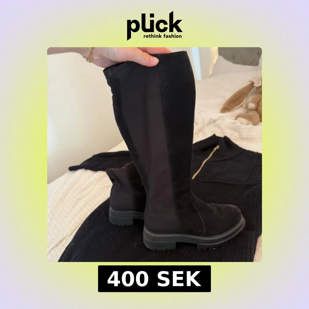 Snygga svarta höga boots med chunky platt sula och rund tå. Ovandelen är i en mix av mocka och stretchigt syntetmaterial som sitter tight längs benet. Perfekta för att lyfta din outfit med en edgy vibe.🖤😍🌟